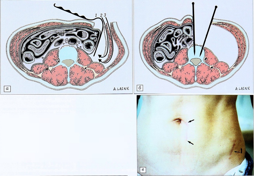 Рис. 2. Доступ к уровню L4-5. a — возможен доступ подбрюшинный (1), либо под поперечной фасцией (2), либо между косой внутренней мышцей и поперечной мышцей (3); б — выполненный доступ с установленными спицами для смещения мягких тканей; в — рубец после разреза кожи (1 — разрез в месте забора костного трансплантата).