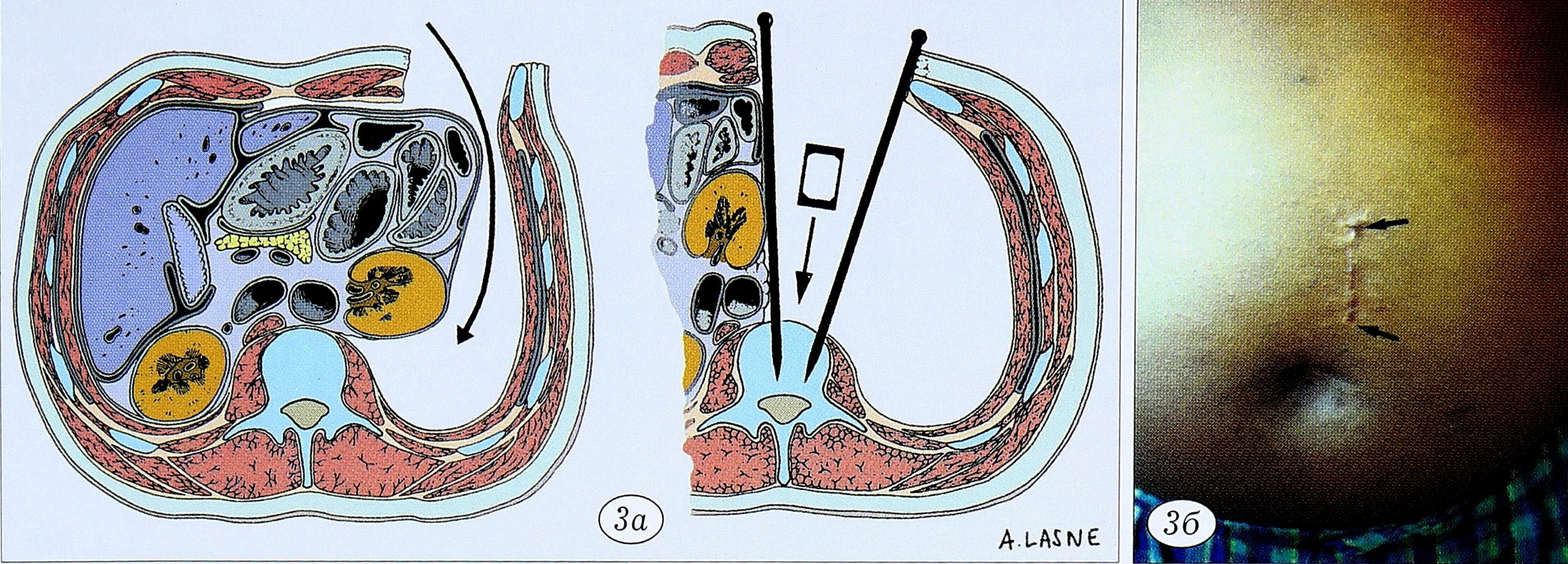 Рис. 3. Типичный доступ к уровню L2-3.a — левая почка смещена в медиальном направлении. Можно поместить трансплантат или межпозвонковую основу под углом от 30 до 45° к сагиттальной оси позвоночника; б — кожный разрез.