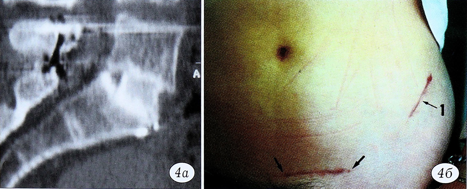 Рис. 4. Операция из переднего доступа к уровню L5~S1.a — сагиттальное изображение на сканограмме через 6 мес после операции; б — горизонтальный разрез кожи (обратить внимание на разрез кожи для взятия трансплантата).