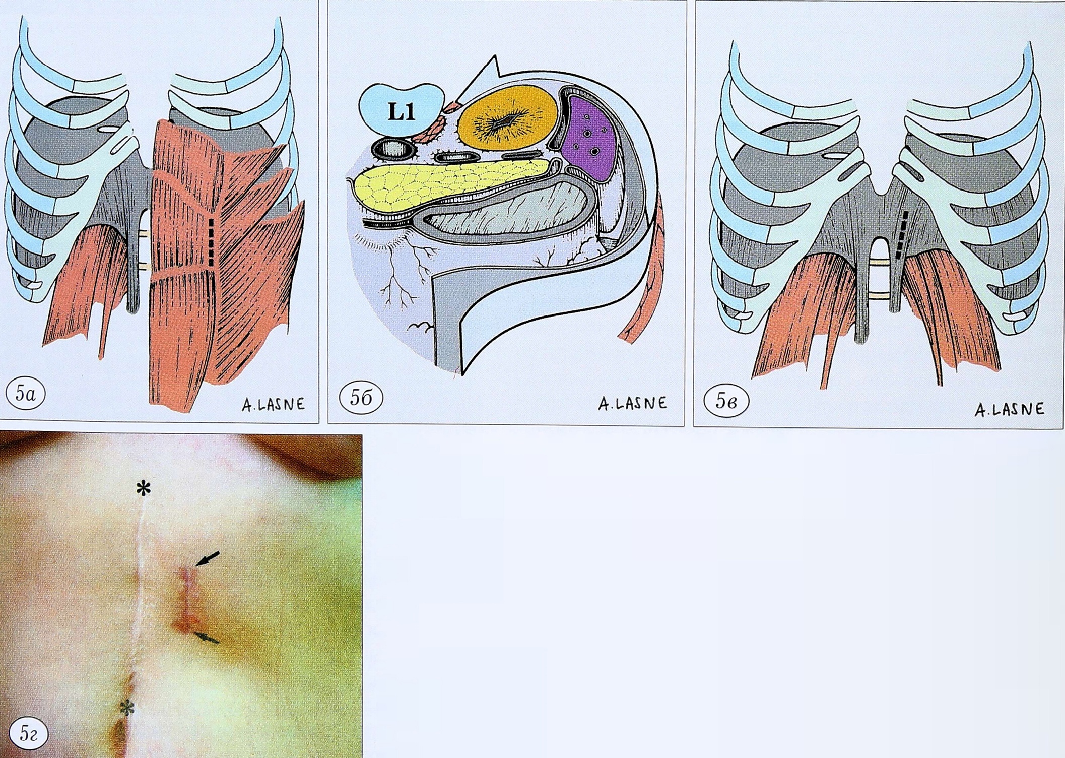 Рис. 5. Доступ к уровням выше L2.а — футляр прямой мышцы живота рассечен латерально слева; б — положение селезенки и почки при доступе к уровню L1; в — разрез левой ножки диафрагмы для подхода к переднебоковой поверхности позвоночника; г — кожный разрез (обратить внимание на наличие старого рубца после трансперитонеальной операции на желудочно-кишечном тракте, что не вызвало никаких проблем).