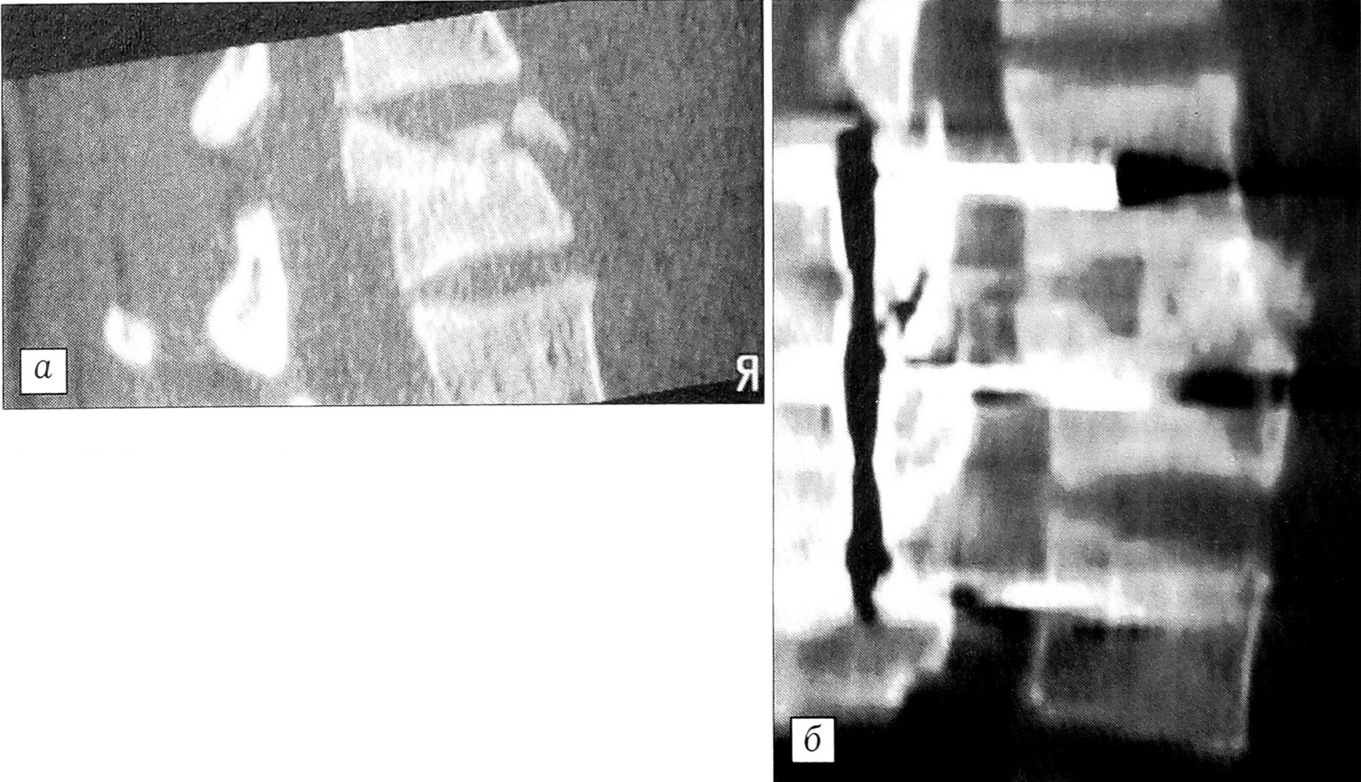 Рис. 7. Перелом L2 с импакцией в вышележащее плато: передний доступ, выполненный после ламинэктомии и репозиции из заднего доступа, с фиксацией транспедикулярной системой. Обратить внимание на положение основы и высоту диска, полученную благодаря трансплантату.а — перед операцией;б — через 6 мес после операции.
