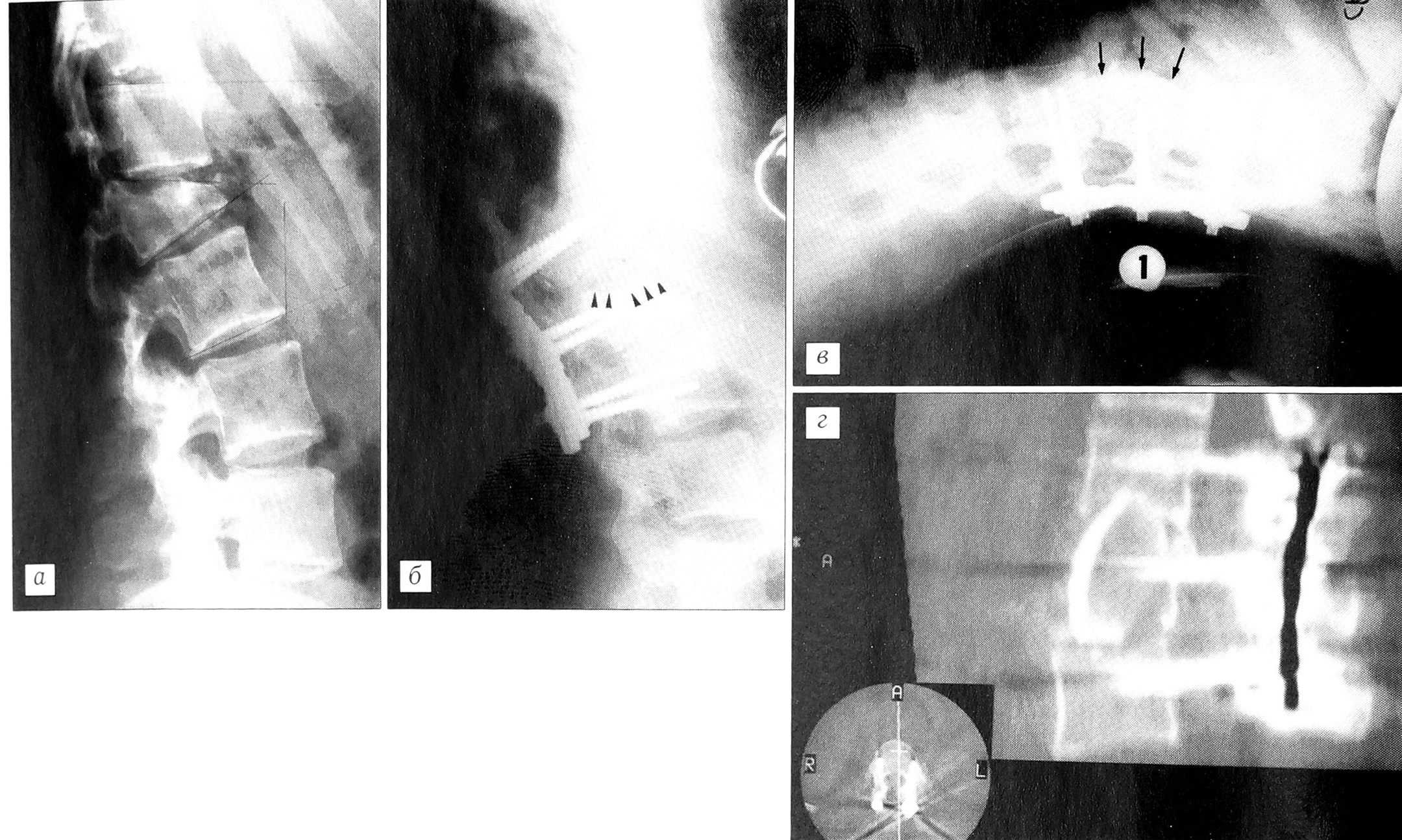 Рис. 8. Перелом Lie деструкцией тела позвонка.a — рентгенограмма до операции; б — после выполнения коррекции из заднего доступа и ламинэктомии (обратить внимание на неполную коррекцию верхнего плато L1 и на межпозвонковое пространство T12-L1); в — во время операции из переднего доступа — корпорэктомии и установки трансплантата на уровне T12-L2 (обратить внимание на лордоз, достигнутый при помощи поясничного валика — 1); г — послеоперационная сканограмма (контроль).