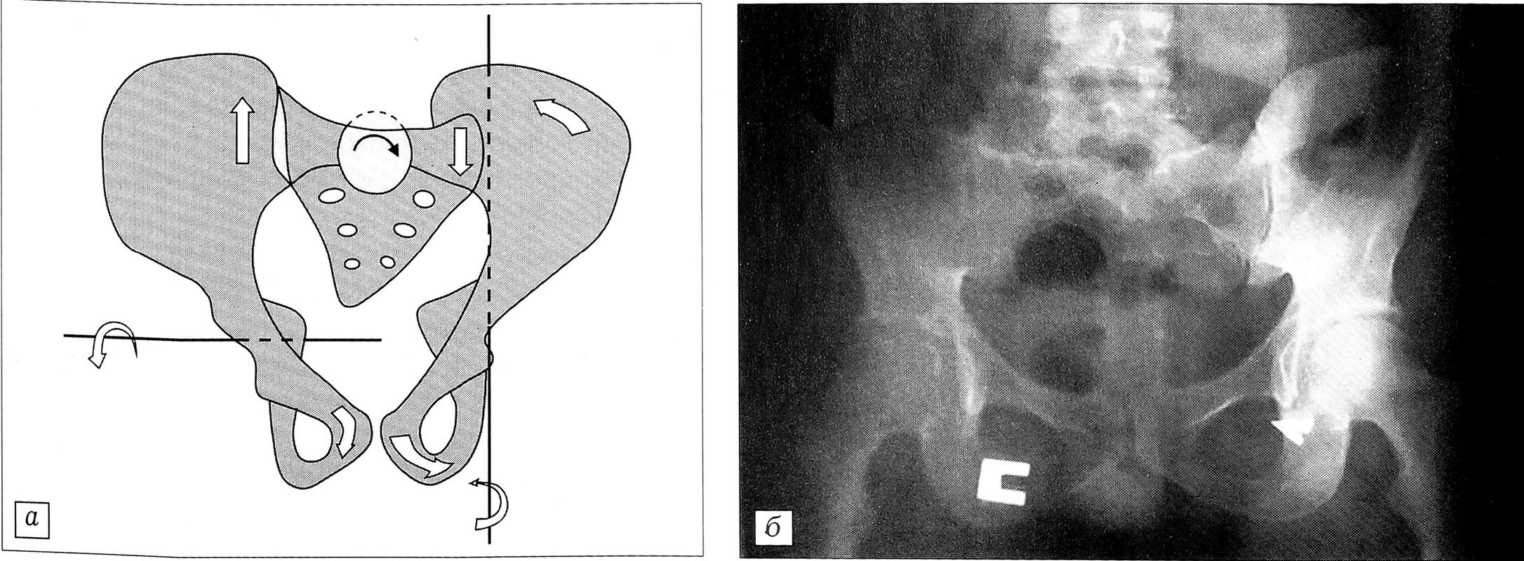 Сдвиг таза по Cramer: схема Cramer (а) и обзорная рентгенограмма таза (б).
