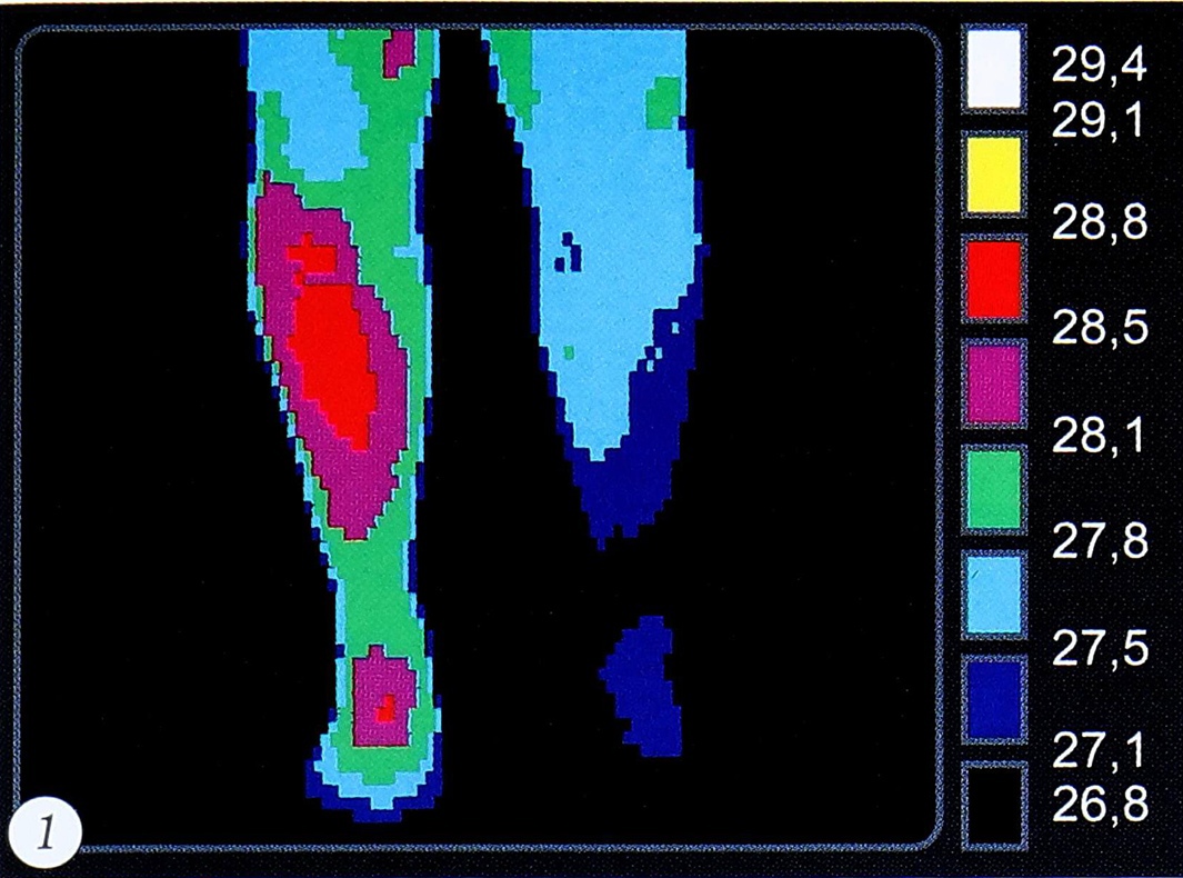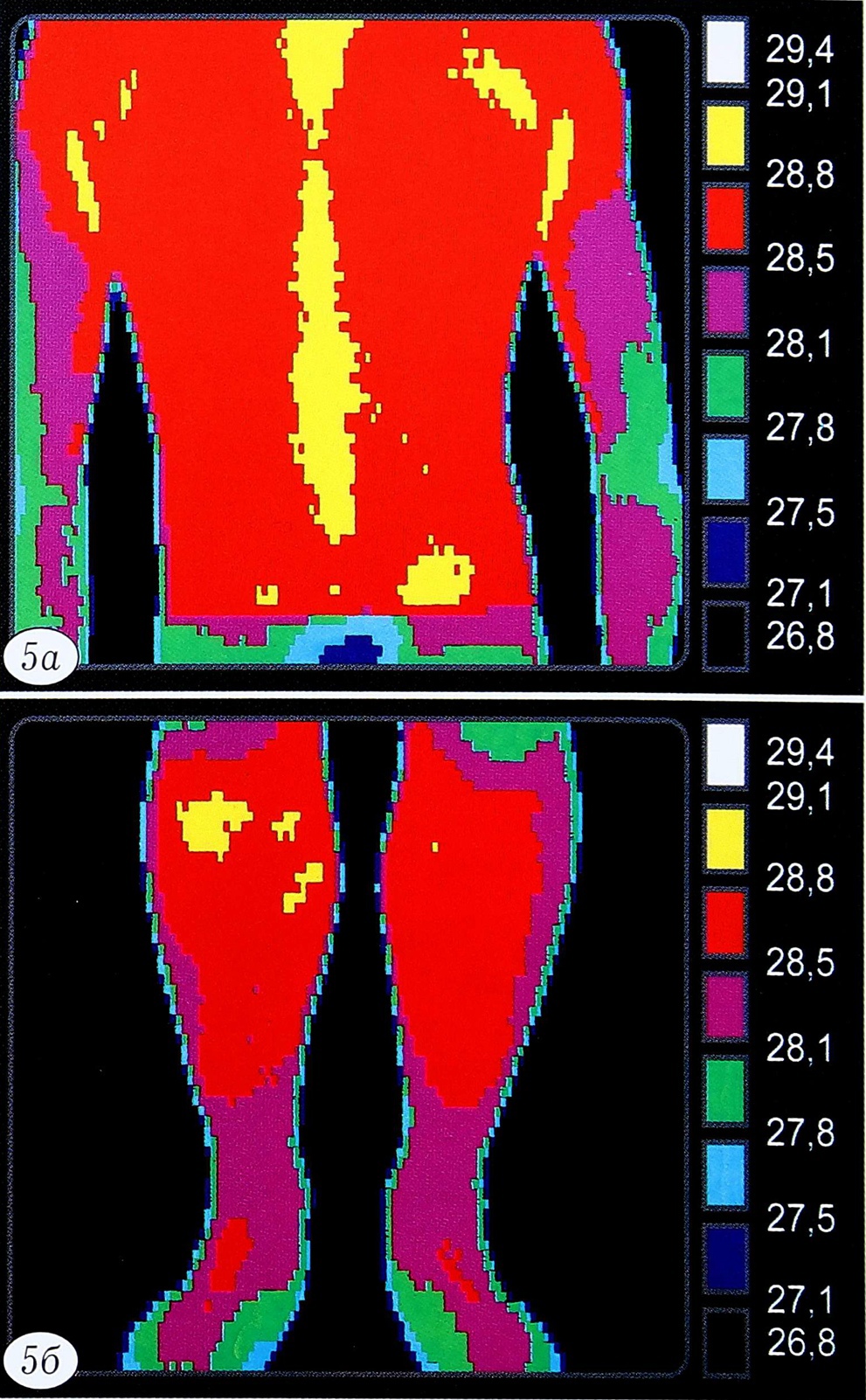 В дерматомах нижних конечностей, как правило, отмечалась гипотермия, преимущественно в области голени и стопы, реже — гипертермия (при небольшой длительности заболевания). Участки нарушенной термотопографии не совпадали с зонами соматической иннервации, и направленность изменения теплопродукции не всегда соответствовала состоянию двигательных и чувствительных корешковых функций (рис. 1).