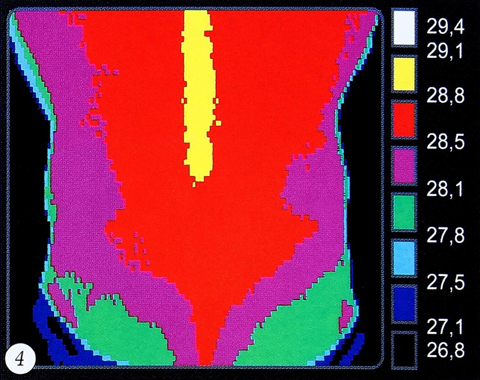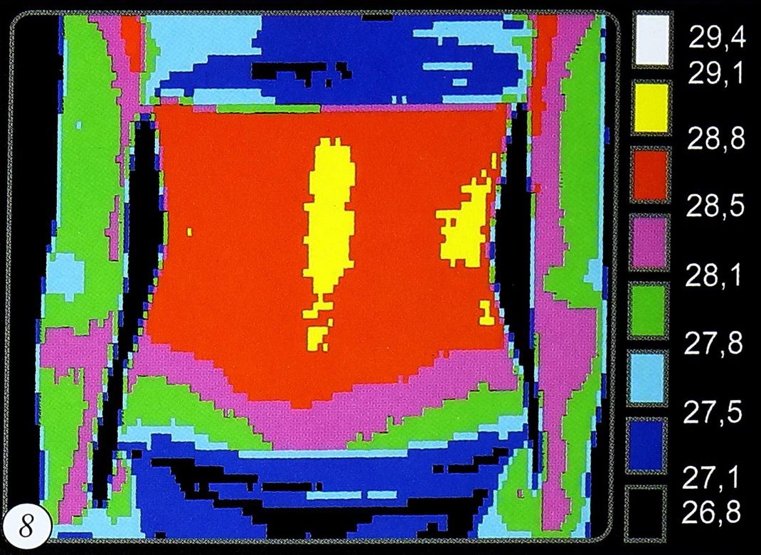 Как показали наши исследования, термография является неспецифическим методом диагностики. Различная вертебральная патология может давать однотипные термоизображения (например, термограммы поясничных зон при спондилолизе и остеохондрозе позвоночника, при патологии крестцово-остистых, крестцово-седалищной связок и остеохондрозе позвоночника). Кроме того, на результаты исследования влияют многие другие факторы, такие как локальный метаболизм, температура окружающей среды, потоотделение. В связи с этим термоасимметрия может наблюдаться и у здоровых людей. По нашим данным, термография имеет ограниченные возможности в диагностике состояния костно-суставных структур позвоночника, определении уровня повреждения корешка, выявлении грыжи межпозвонкового диска. Для этого необходимо использовать методы лучевой диагностики, клинико-неврологическое обследование. Данные термографии должны оцениваться только в комплексе с результатами этих исследований.