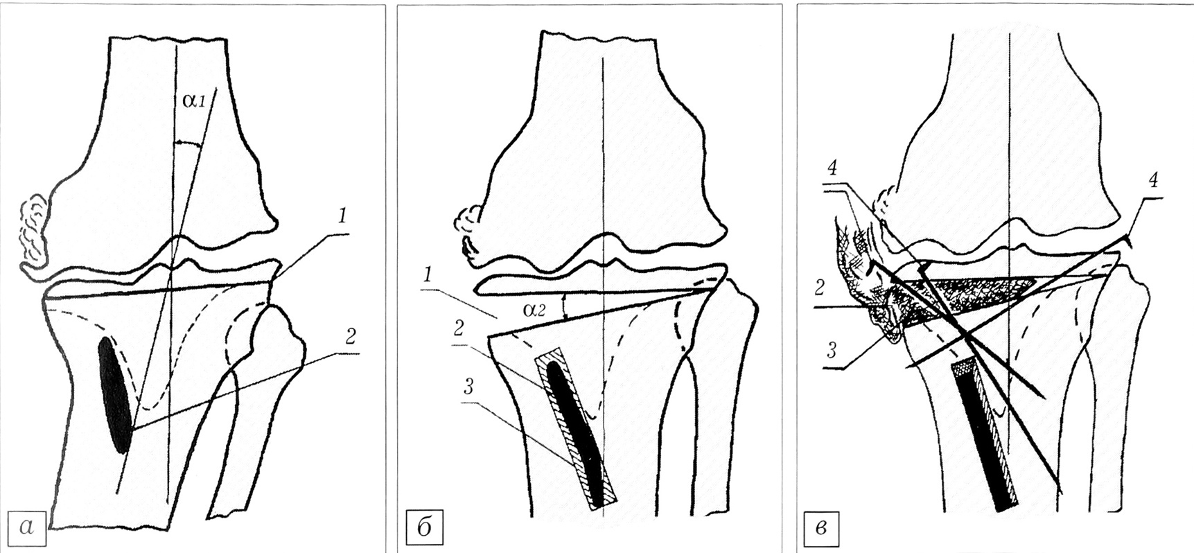Рис. 1. Схема операции.а — линия остеотомии; б — клиновидный дефект большеберцовой кости после коррекции варусной деформации; в — положение после пластики аутотрансплантатом на питающей ножке.1 — линия остеотомии, 2 — место прикрепления питающей ножки («гусиной лапки»), 3 — костный аутотрансплантат, 4 — фиксирующие спицы.