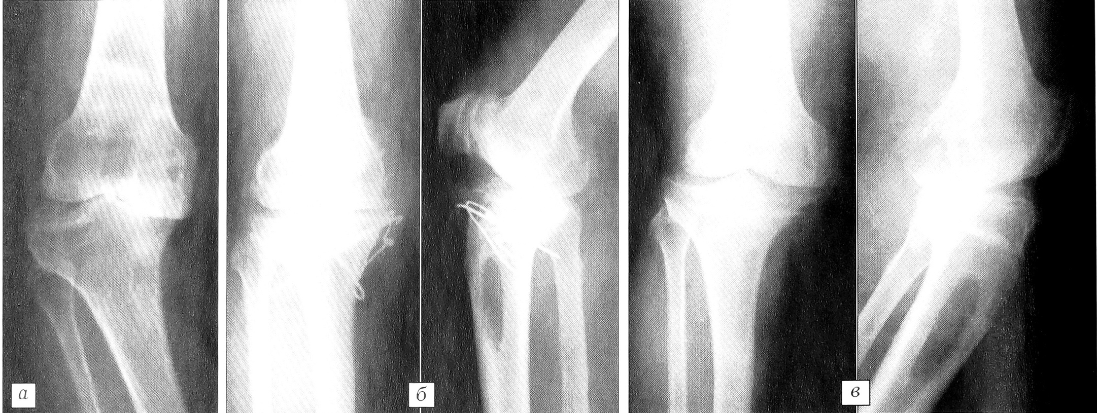 Рис. 2. Рентгенограммы правого коленного сустава больной К.a — до операции; б — непосредственно после операции; в — через 7 мес после операции.