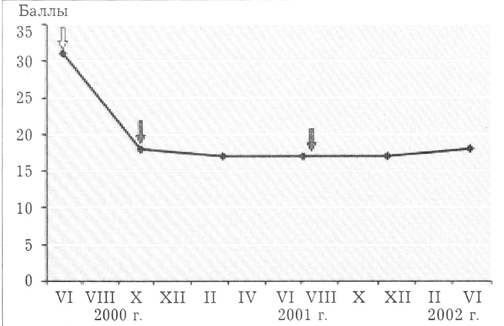 Наблюдение за больной с использованием балльной скрининговой системы контроля показало стойкое снижение тяжести заболевания с 31 (декомпенсированная форма) до 18 (субкомпенсированная форма) баллов (рис. 3). Объективным подтверждением исчезновения болевого эндостального синдрома явилось снижение ВКД с 2,8 кПа перед операцией до 0,8 кПа через 1,5 года после оперативного лечения.