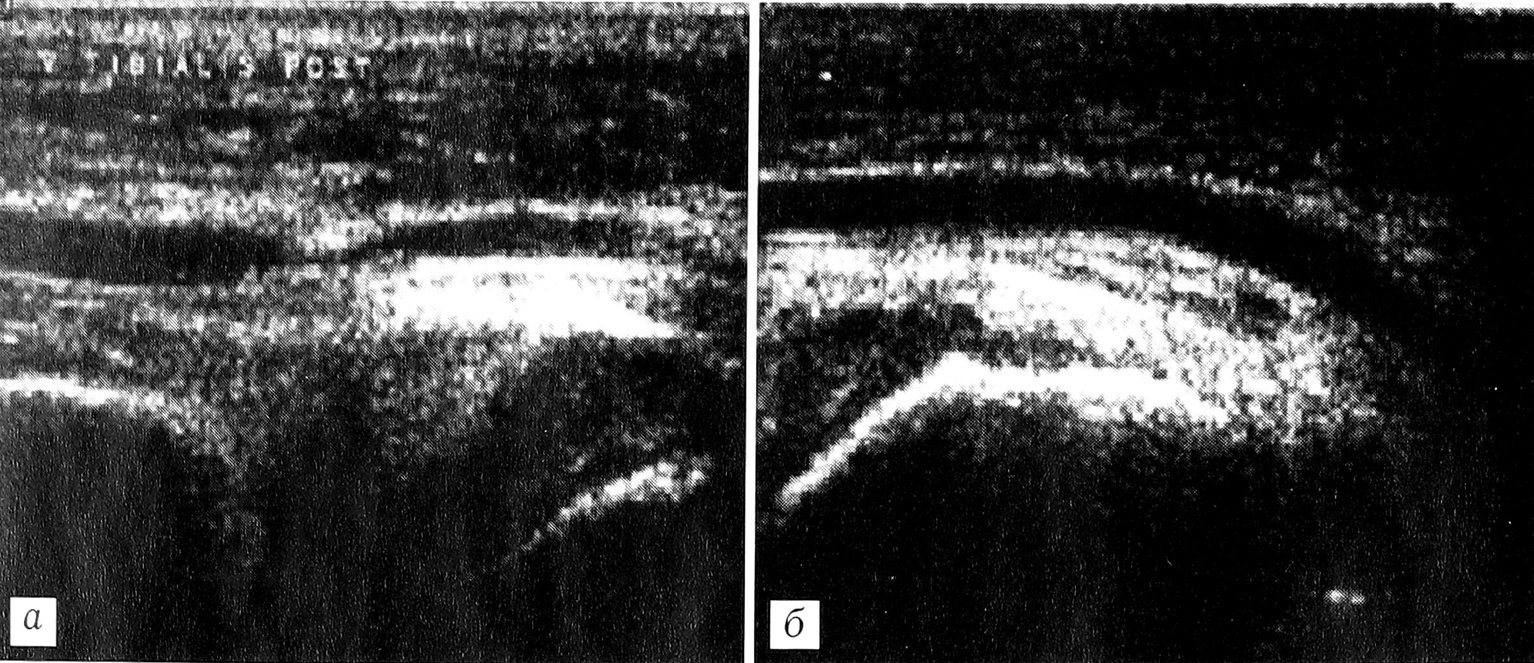Дуплексное исследование глубоких вен голени у больного Л. (В-режим).а — на 2-е сутки после травмы: гипоэхогенное образование в средней трети v. tibialis posterior;б — через 2 мес после травмы: проходимость сосуда сохранена, сужения сосуда нет.