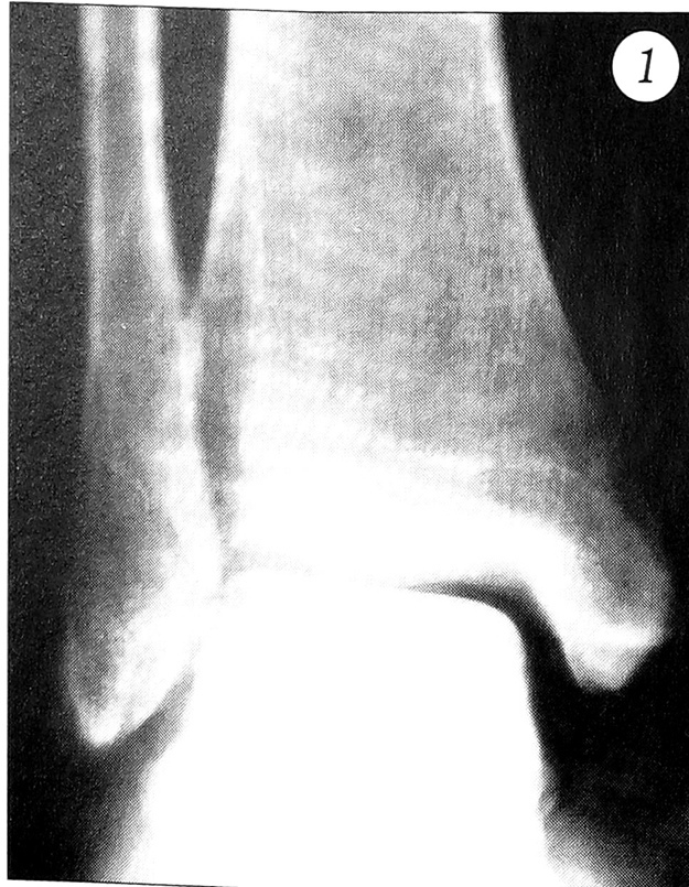 Рис 1. Рентгенограмма правого голеностопного сустава больной С. 29 лет. Диагноз: повреждение передней малоберцово-таранной связки, отрыв кортикальной пластинки от наружного края тела таранной кости.