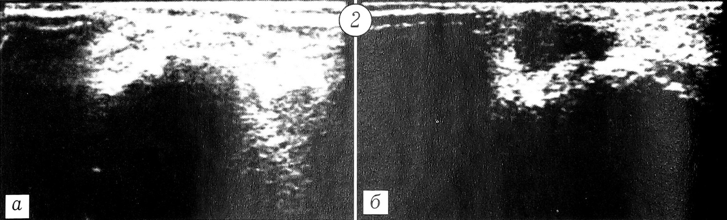 Рис. 2. Эхограммы голеностопных суставов той же больной С.a — интактный левый сустав; б — поврежденный правый: участок гипоэхогенности у места прикрепления латеральных связок к костям стопы.