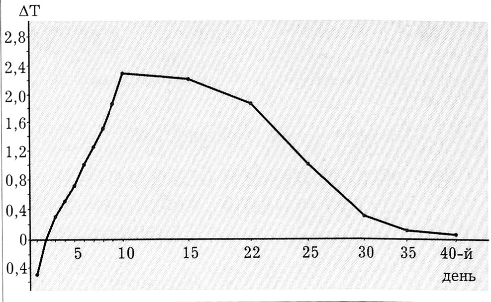 С первых часов и до конца суток после травмы температура в области повреждений была ниже на 0,4~0,6°, что свидетельствовало о тяжелом посттравматическом ангиоспазме. Термоасимметрия в других отделах поврежденного и интактного суставов не превышала 0,Г. В последующие 10 дней измерения повторяли ежедневно, исследование проводили до восстановления целости капсульносвязочного аппарата. Динамика температурного градиента в разные сроки после травмы представлена на рис. 3. Из него видно, что со 2-х суток этот показатель увеличивался на 0,2-0,3°, достигая максимума к 10-му дню. В последующие 4-6 дней он удерживался в диапазоне 2,2~2,3°, а к 30-40-му дню постепенно снижался до 0,1~0,3°.