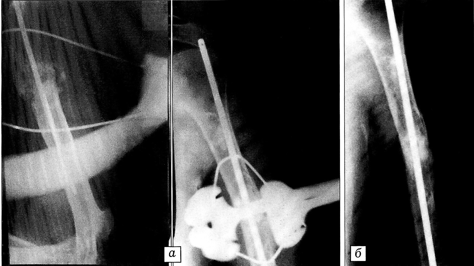 2. Rice. 1. Example 1. Radiographs of patient T.a - false joint of the humerus 8 months after fixation of bone fragments with a pin. Two knitting needles are held, stretched in one bracket; b — 4 months later: the fracture healed, the apparatus was removed.