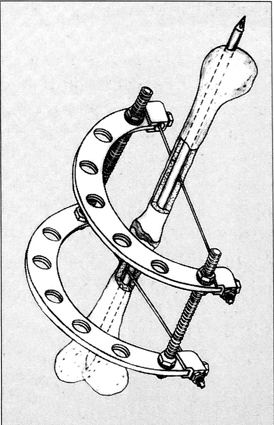 В тех случаях, когда несросшийся перелом или ложный сустав сопровождался контрактурой близлежащего сустава, больным, также не удаляя интрамедуллярный фиксатор, накладывали шарнирно-дистракционный аппарат. Его осевая и замыкающая спицы служили для фиксации костных отломков выше и ниже места перелома, а поворотные спицы (составляющие вместе со скобами поворотную часть аппарата) проводились в другой суставной конец. Это позволяло эффективно осуществлять разработку движений в суставе.