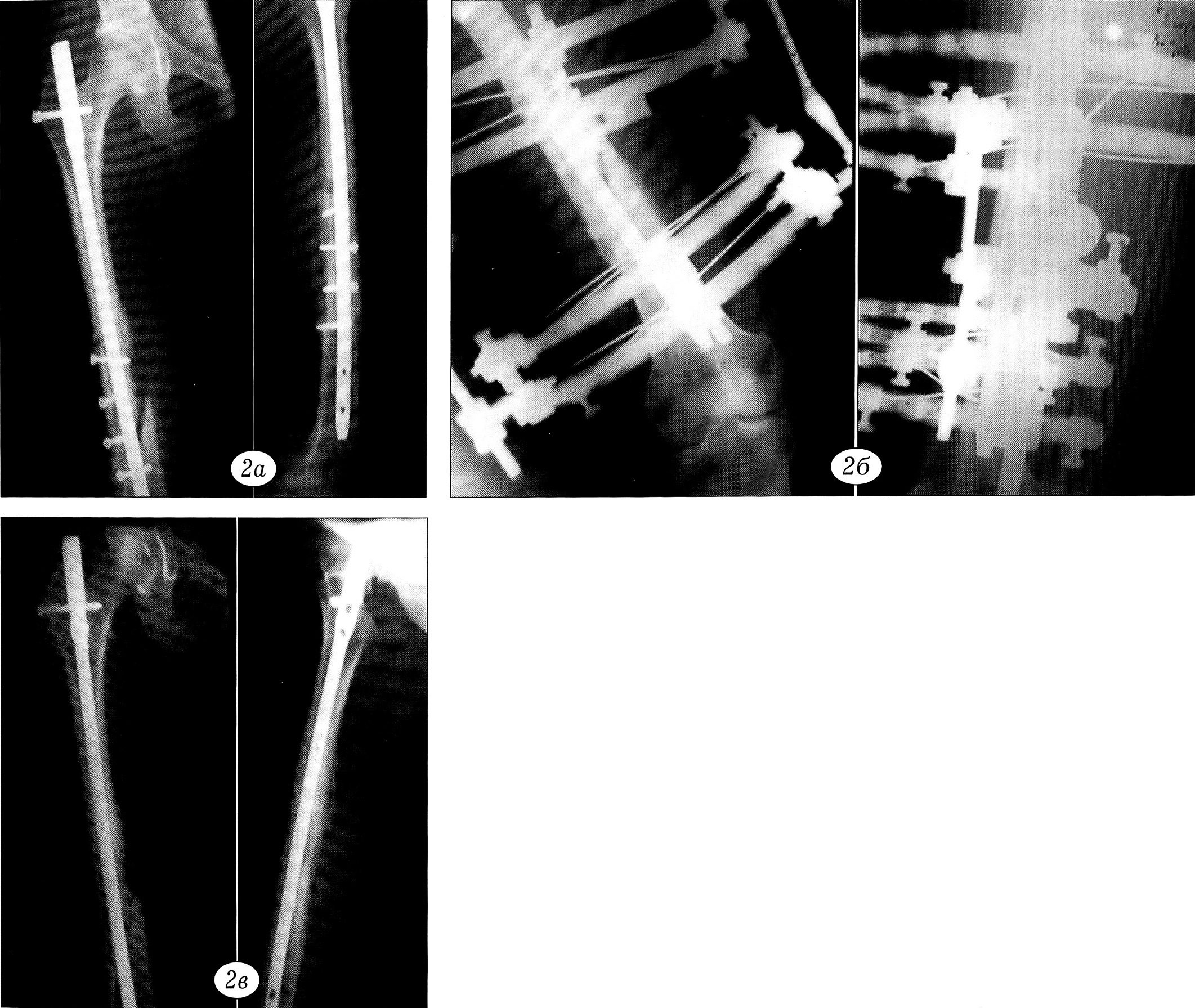 4. Rice. 2. Example 2. Radiographs of the patient E.a — ununited comminuted fracture of the femur 6 months after osteosynthesis with an intramedullary nail and screws; b — 4.5 months after the application of the external fixation device: fracture consolidation; c — after dismantling the device.