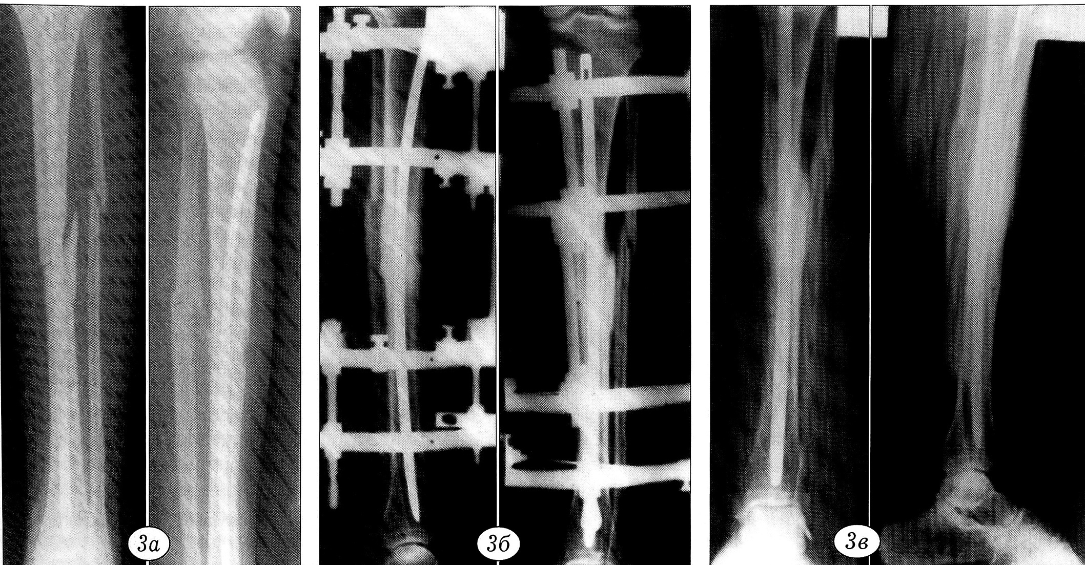 Рис. 3. Пример 3.Рентгенограммы больной В.a — несросшийся перелом большеберцовой кости через 4 мес после интрамедуллярного остеосинтеза металлическим штифтом;б — после наложения аппарата наружной фиксации;в — спустя 4,5 мес: перелом сросся, аппарат удален.