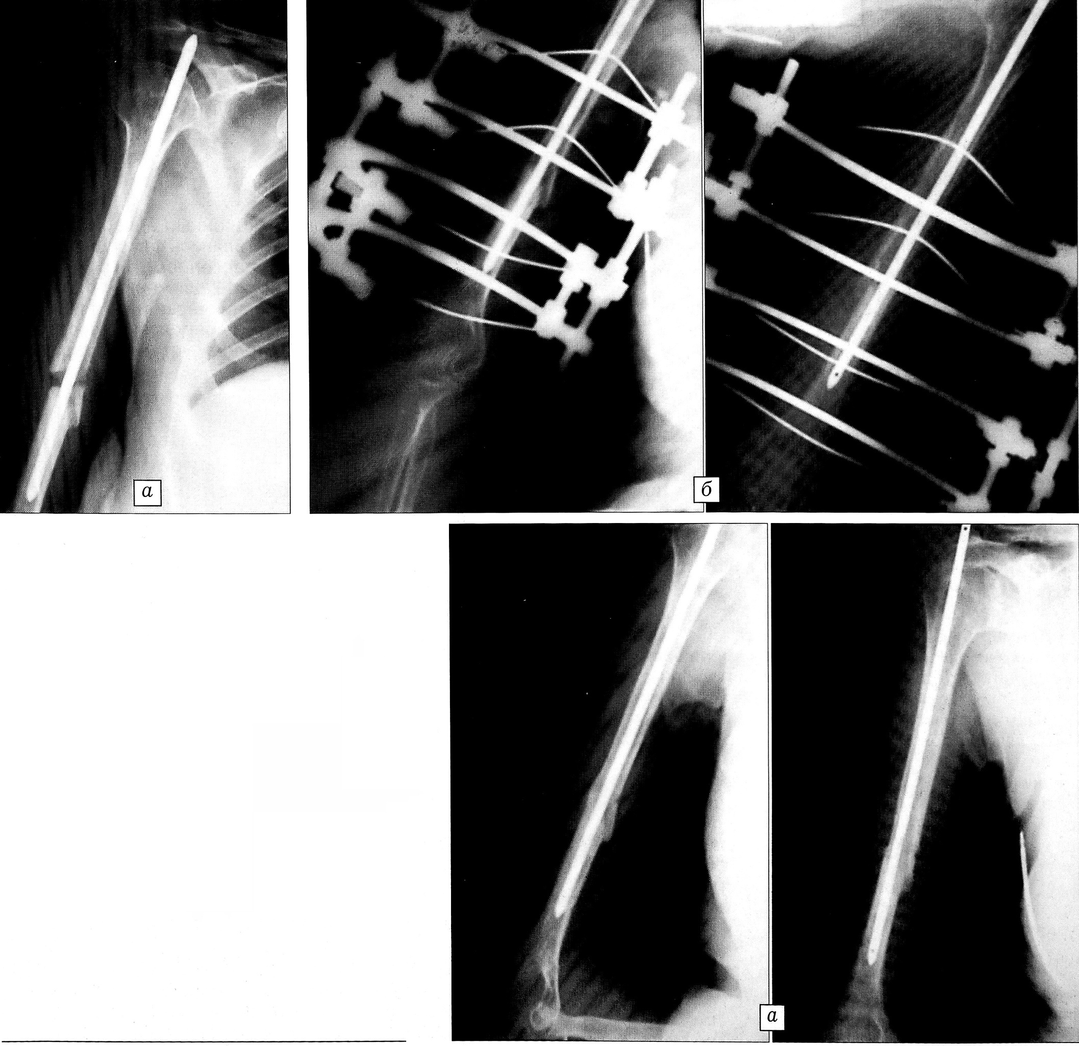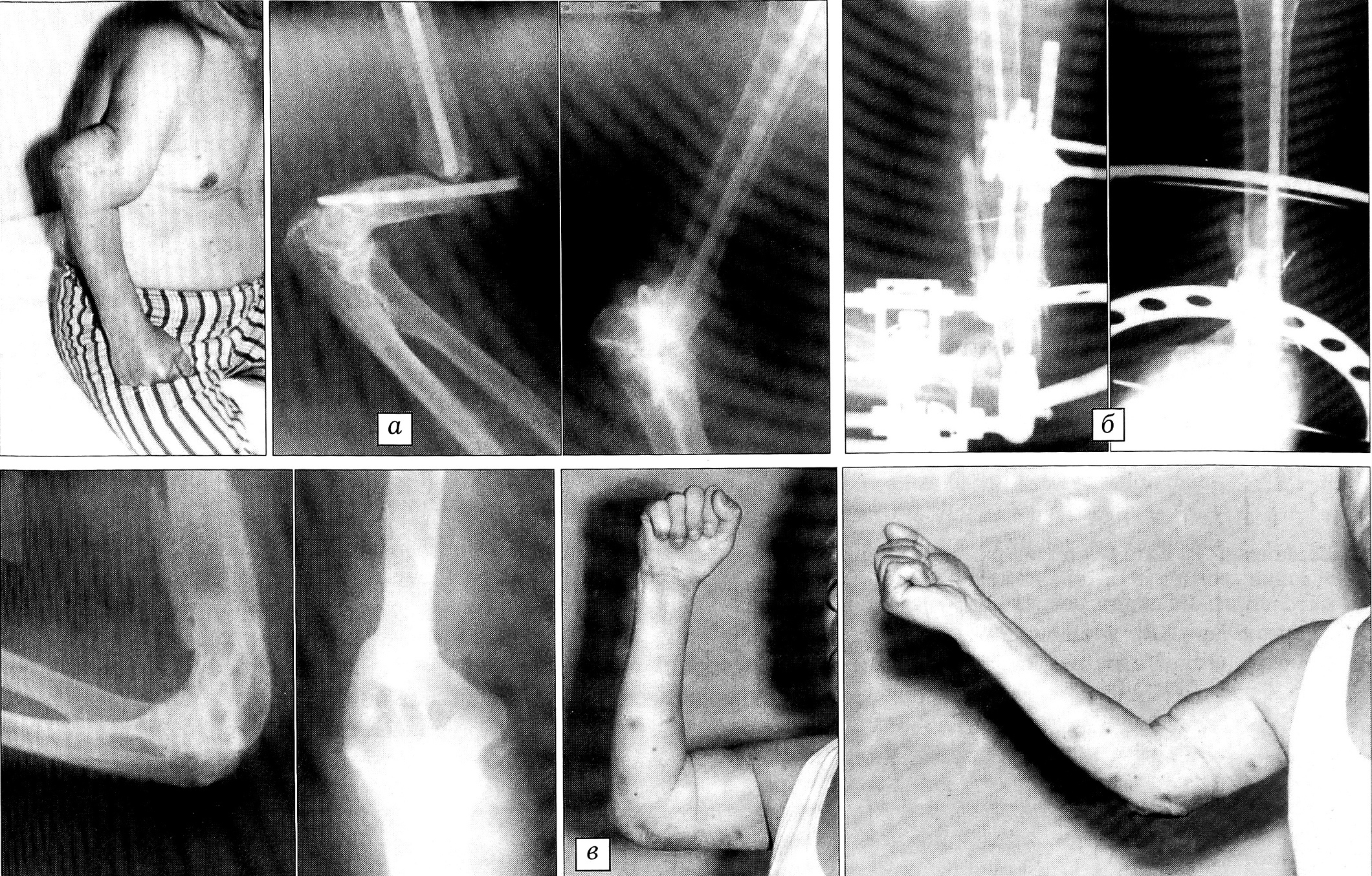 Рис. 6. Пример 6.Больной К., ложный сустав плечевой кости через 11 мес после интрамедуллярного остеосинтеза штифтом, перелом штифта и смещение костных отломков.а — при поступлении в ЦИТО; б — произведены повторный остеосинтез штифтом, костная пластика, наложен аппарат наружной фиксации; в — через 5 мес: перелом сросся, функция локтевого сустава восстановлена.