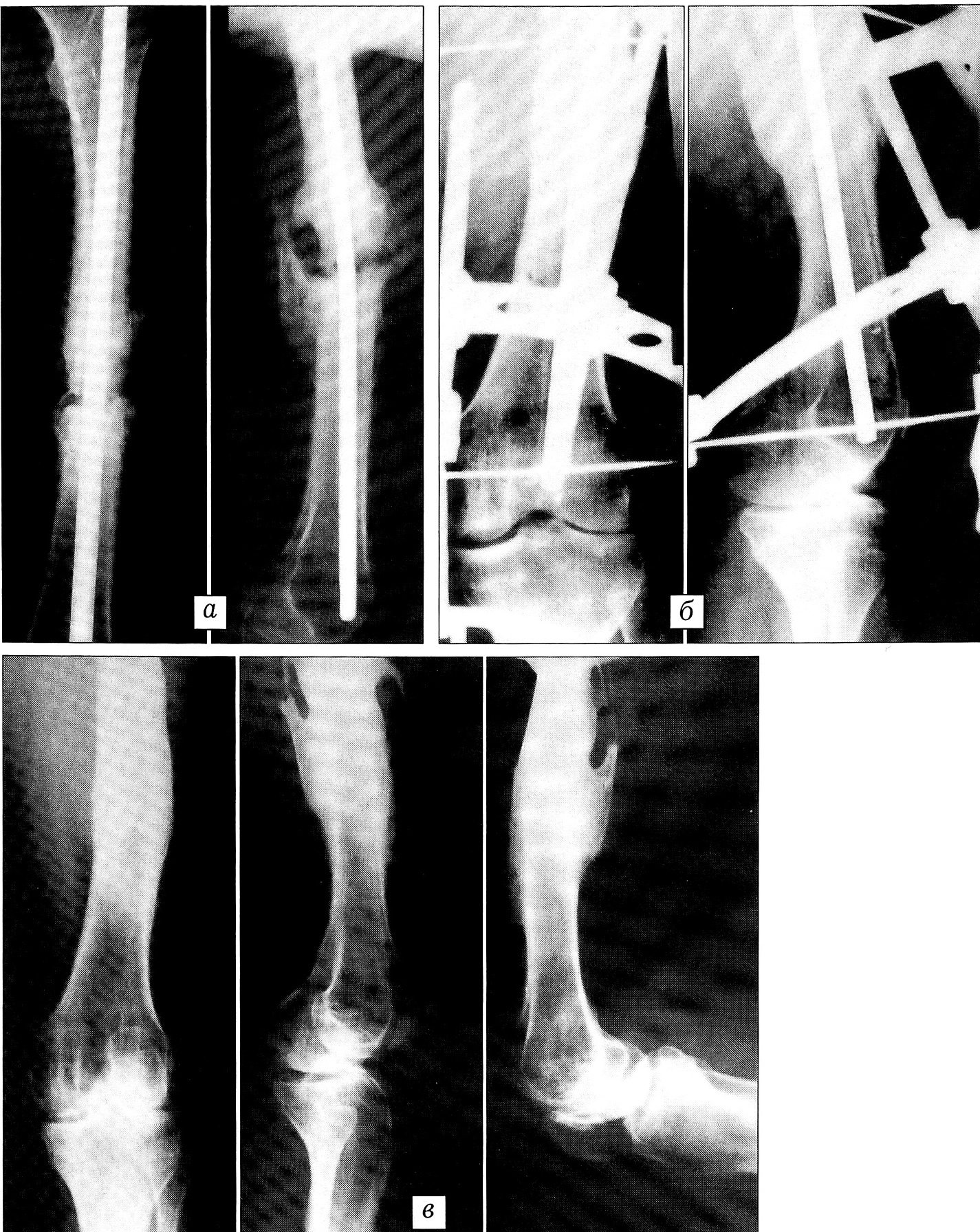 Рис. 5. Пример 5.Рентгенограммы больного Д.a — ложный сустав бедренной кости, контрактура коленного сустава через 8 мес после интрамедуллярного остеосинтеза штифтом;б — после наложения шарнирнодистракционного аппарата;в — спустя 8 мес: достигнуто сращение перелома и восстановление функции коленного сустава.