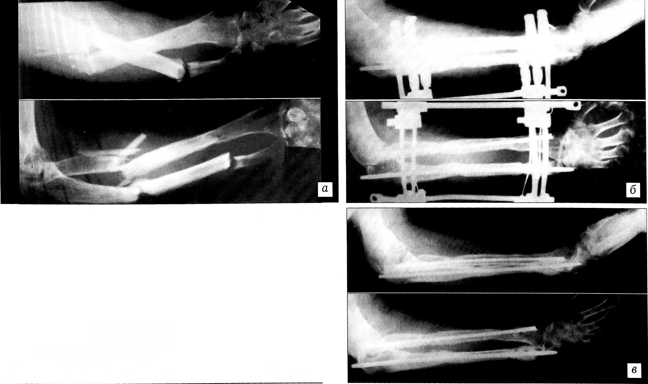 Рис. 7. Пример 7.Рентгенограммы больного П.a — двойные переломы лучевой и локтевой костей;б — несросшиеся переломы обеих костей после интрамедуллярного остеосинтеза. Наложен аппарат чрескостной фиксации;в — через 3 мес: переломы срослись, аппарат снят.