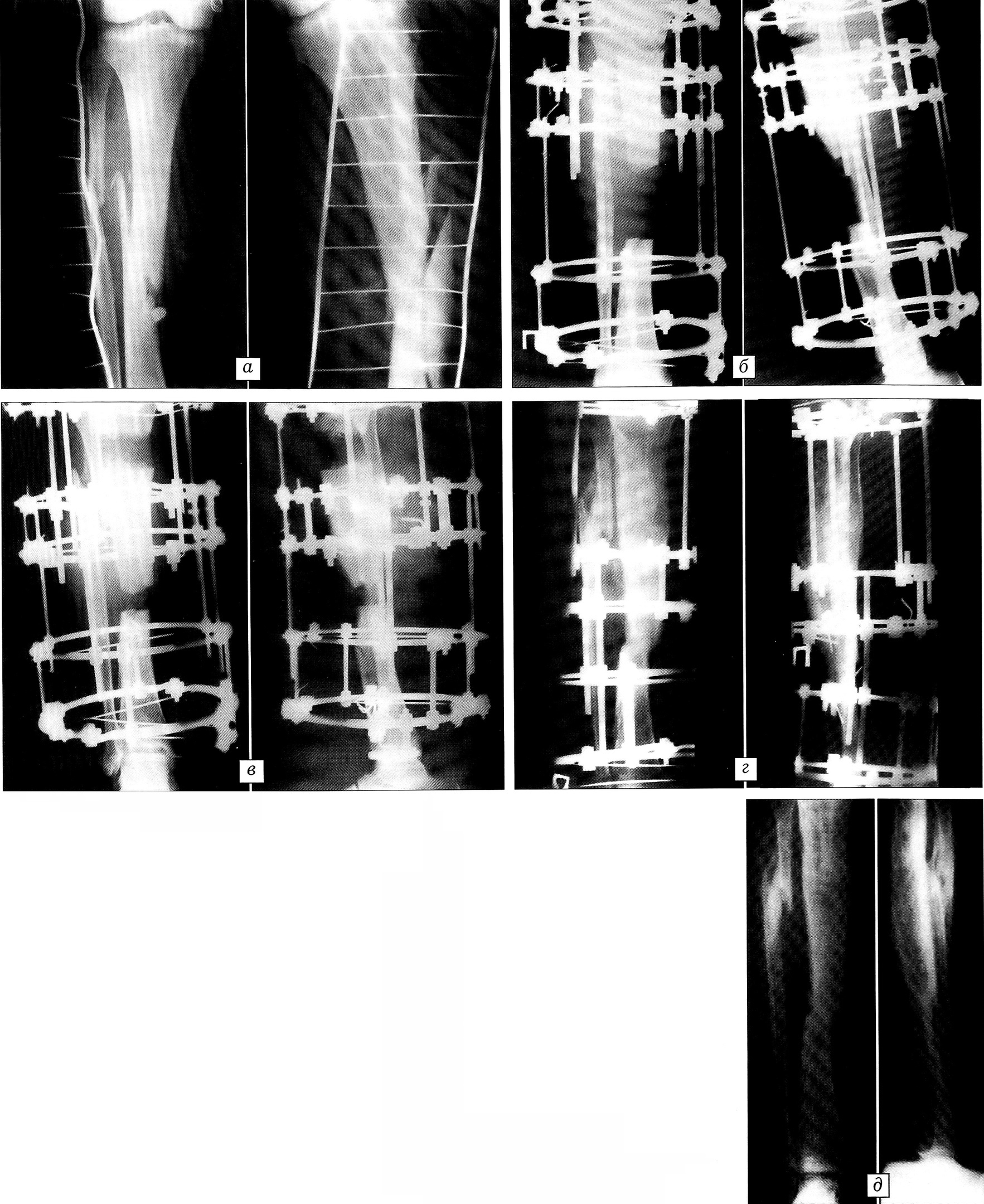 Рентгенограммы больного С. 51 года. Огнестрельный оскольчатый перелом костей правой голени, осложненный гнойной инфекцией.а — до лечения; б — после резекционной секвестрнекрэктомии и кортикотомии проксимального отломка большеберцовой кости; в — в процессе замещения дефекта большеберцовой кости; г — перед снятием аппарата Илизарова: перелом большеберцовой кости сросся, дефект замещен дистракционным регенератом; д — после демонтажа аппарата.