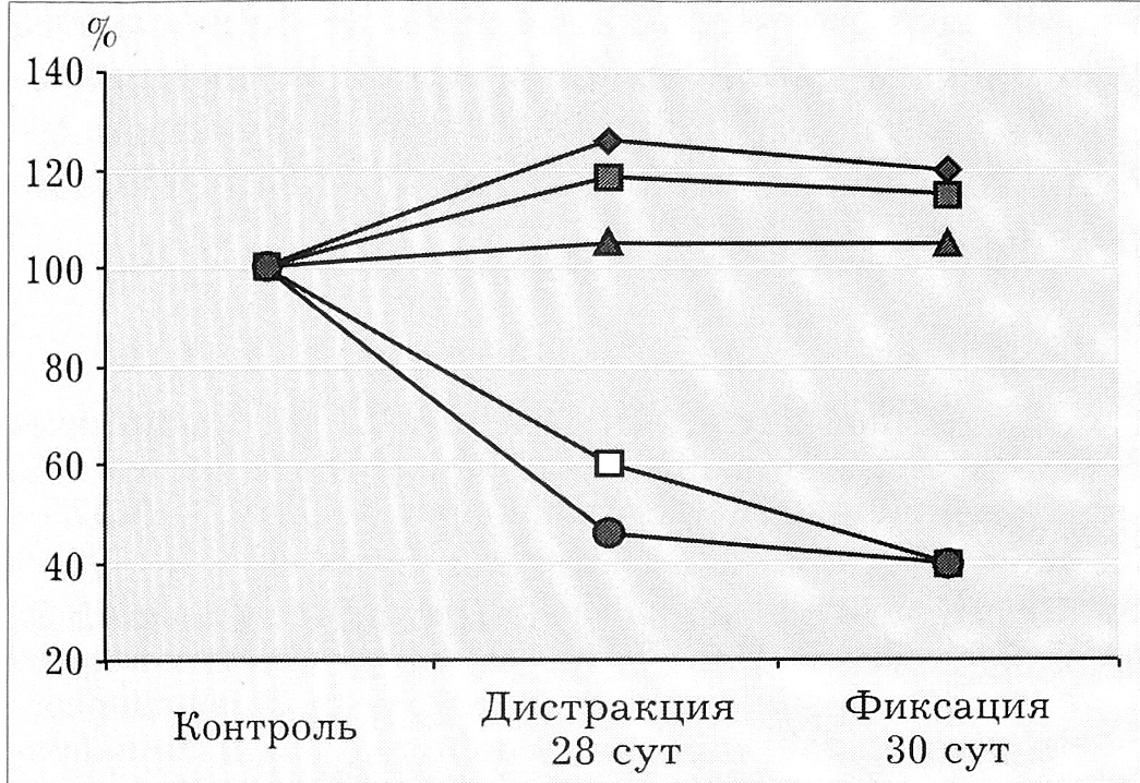 Контролем служили показатели, зарегистрированные перед оперативным вмешательством. В опыте исследования проводили по окончании дистракциии и фиксации. Дополнительно брали пробы крови из большой подкожной вены перед началом и через каждые 7 сут дистракции. Из полученных данных составляли невзвешенные вариационные ряды, определяли средние, ошибку, достоверность средних и их различий по Стьюденту. Все средние приведены с уровнем достоверности не менее 95%. Данные по срокам сравнивали с контрольными значениями.