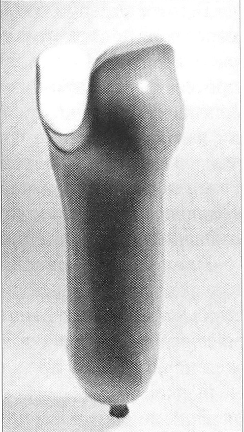 Особенностью протезирования культи голени (в отличие от культи бедра) является отсутствие большого массива мягких тканей, которые могли бы служить мягкой прокладкой между стенкой протеза и костями голени. Приемную гильзу протеза голени (рис. 1, 2) мы изготавливаем по контактному принципу и обеспечиваем глубокую посадку культи. Для этого приемную гильзу подгоняем плотно по культе, но не сдавливаем ее. На дно гильзы помещаем контактную подушку, боковыми и передними стенками максимально охватываем область коленного сустава. Высота передней стенки достигает середины надколенника или полностью охватывает его.