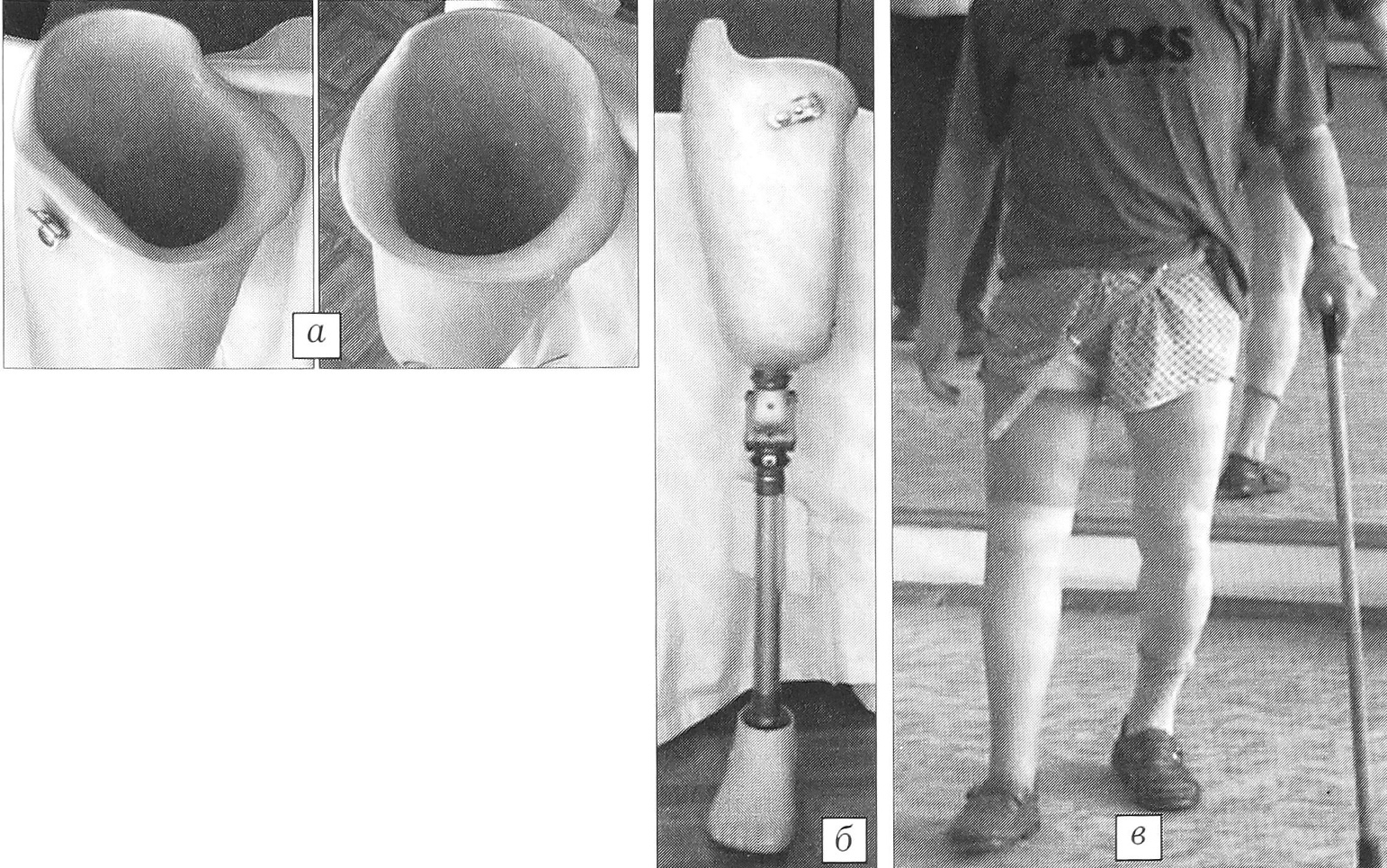 Рис. 3. Приемная гильза протеза бедра (а); протез в сборке без косметической отделки (б); больной с посттравматической культей правого бедра в средней трети на протезе (в).