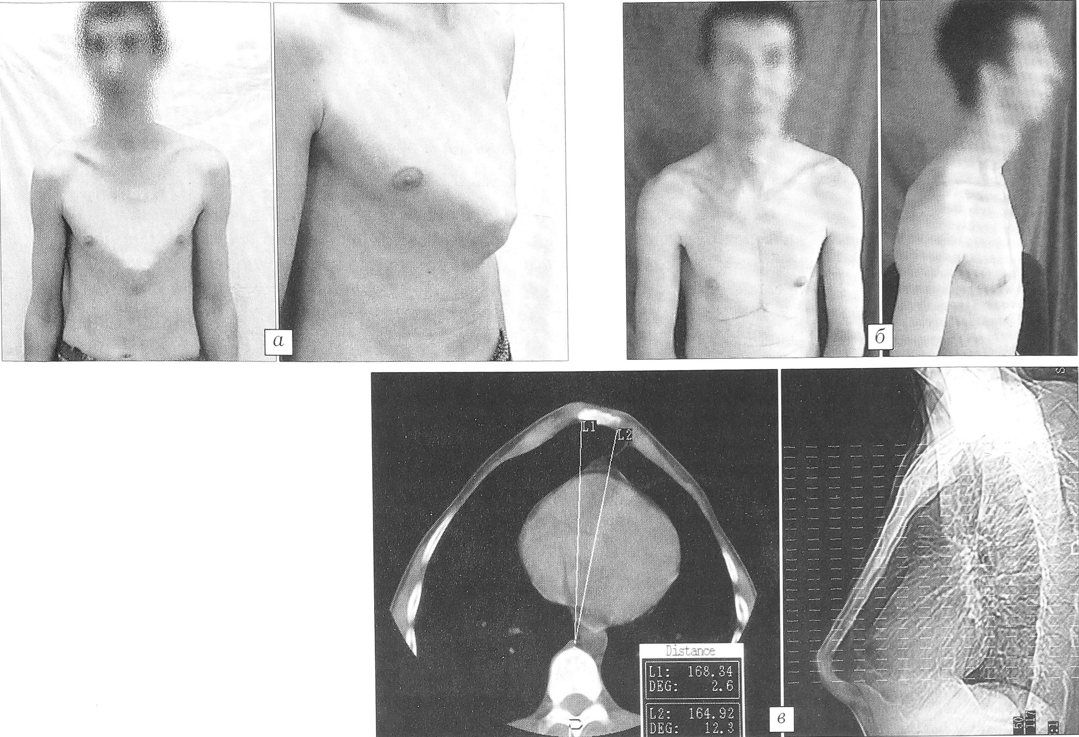Рис. 4. Больной Н. 18 лет. Килевидная деформация грудной клетки. а — внешний вид до оперативного лечения, б — через 3 года после торакопластики по Ravitch; в — компьютерные томограммы грудной клетки до операции.