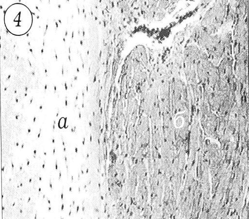Рис. 5. Тяж, построенный по типу сухожилия: а — пучки первого порядка; б — рыхлая соединительнотканная прослойка между пучками второго порядка. Ув. 7,1x9.