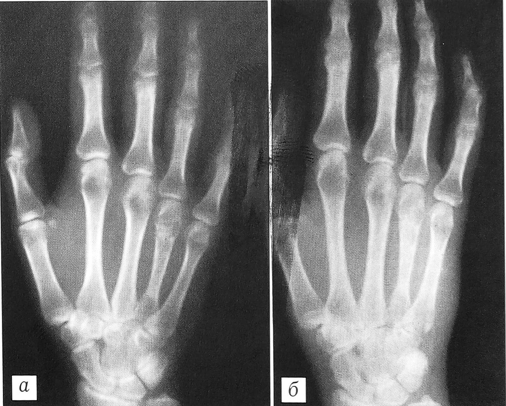 Рис. 1. Рентгенограммы больной П. 24 лет. Диагноз: хондрома IV пястной кости.a — после операции с пластикой дефекта «Остеоматриксом»; б — через 1 мес.