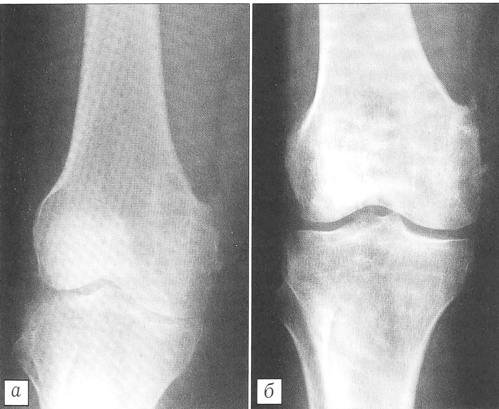 Рис. 2. Рентгенограммы больной Т. 41 года. Диагноз: воспалительный процесс в области внутреннего надмыщелка правой бедренной кости.а — после открытой биопсии; б — через 3 мес после операции с пластикой дефекта «Остеоматриксом».