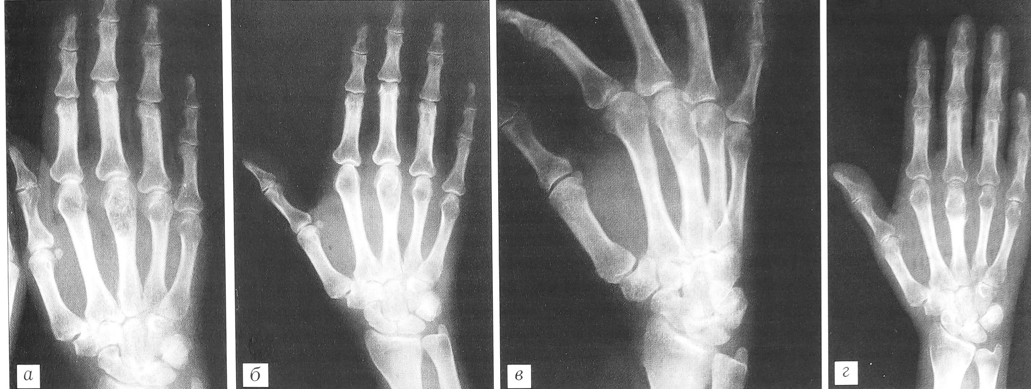 Рис. 5. Рентгенограммы больной К. 51 года. Диагноз: хондрома III пястной кости.а — до операции; б — после операции с пластикой дефекта «Остеоматриксом»; в — через 1 мес; г — через 5 мес.