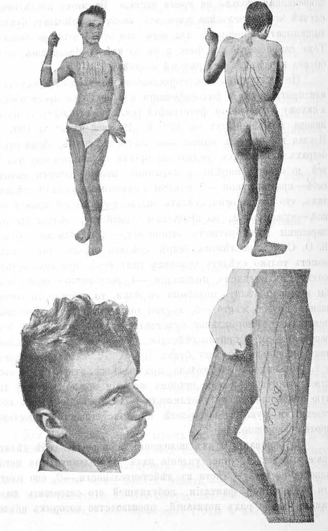Но наилучшимъ подтвержденіемъ возможности симуляціи или притворства и фальсификаціи или поддѣлки преступленія я нахожу въ изученіи фотографій (см. рис. стр. 648). г. Мельникова, помѣщенныхъ въ 452 № „Русской рѣчи“ за 1907 г. Изучая всѣ порѣзы, нанесенные на груди, спинѣ, лѣвой рукѣ, бедрахъ и голеняхъ, нельзя не прійти къ заключенію, что 1,всѣ до одного порѣзы и царапины можно нанести самому себѣ—правой рукой, —2,порѣзы и царапины на спинѣ сдѣланы такъ, что ихъ можно сдѣлать только собственной правой рукой, —чужая рука, по привычному свойству, дѣлала бы эти царапины въ обратномъ отношеніи, —3,вырѣзываніе буквъ Б. О. С. Р. на лѣвомъ бедрѣ сдѣлано именно такъ, какъ можетъ только сдѣлать человѣкъ самъ себѣ, при подогнутомъ колѣнѣ въ сидячемъ положеніи, —4,постороннее лицо, если бы вздумало дѣлать подобныя вырѣзки, то выбрало бы совершенно другое мѣсто, —5,трудно допустить, чтобы здоровый человѣкъ, съ нормальной чувствительностью, допустилъ безъ сопротивленія и противодѣйствія, постороннему лицу сдѣлать такъ правильно вырѣзку буквъ Б. О. С. Р., какъ это сдѣлано у г. Мельникова, —6, только при вырѣзкѣ этихъ буквъ собственною рукою и при личномъ желаніи можно получить такую правильность и отчетливость, —7, вырываніе волосъ собственными руками на головѣ при экстатической анестезіи вполнѣ возможно.