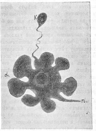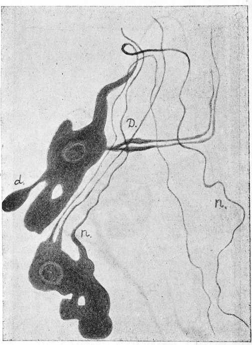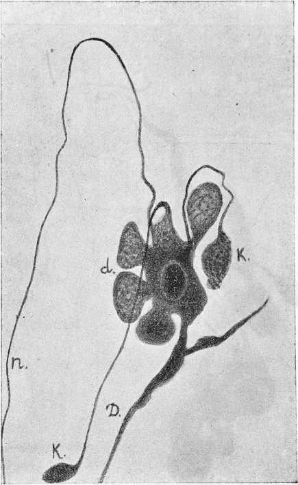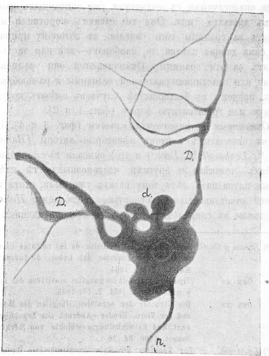 n—нервный отростокъ, d—субкапсулярные булавовидные дендриты перваго рода. D—дендриты второго рода. k — концевыя колбы. Виденъ пигментъ въ концевыхъ булавахъ (d) и у мѣста выхода нервнаго отростка. Сердце. Окраска метиленовою синью. Leitz. Ос. 4,Obj. 7.