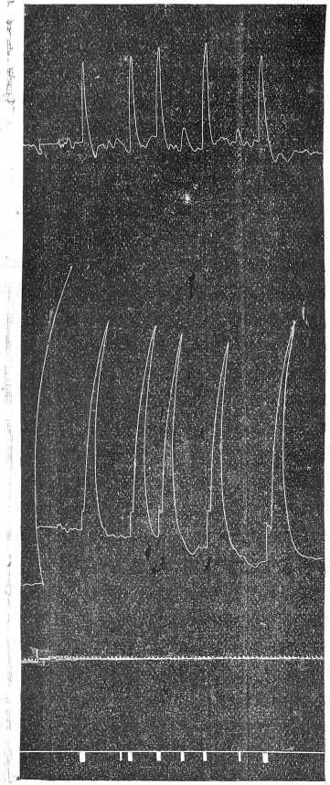 Раздраженія центральнаго конца этого нерва производились почти во всѣхъ опытахъ; вслѣдствіе этого, у насъ накопилось большое количество кривыхъ, представляющихъ изъ себя результаты раздраженій нерва. Изученіе этихъ кривыхъ позволило притти къ нѣкоторымъ интереснымъ выводамъ, къ изложенію которыхъ мы и переходимъ.