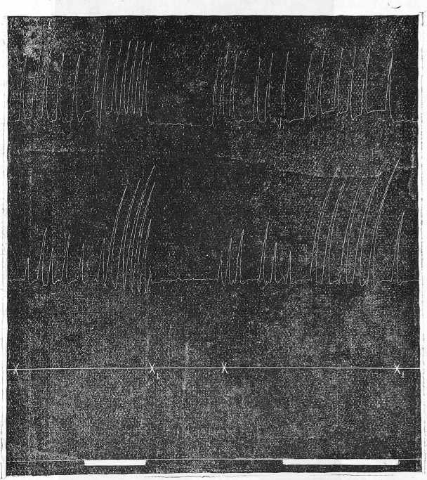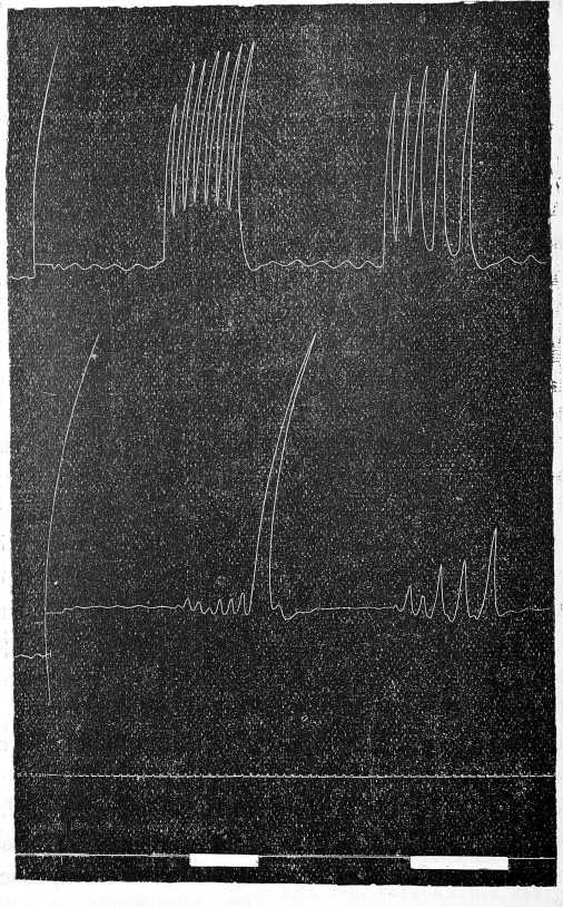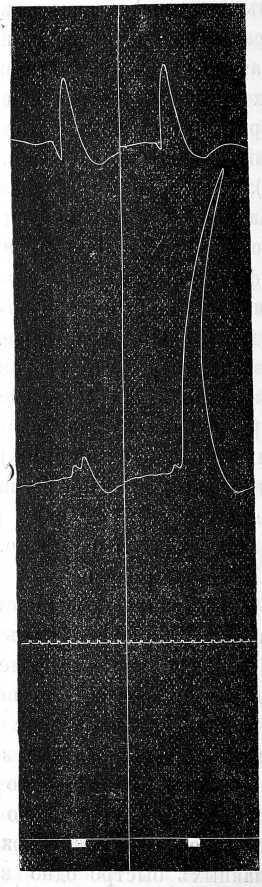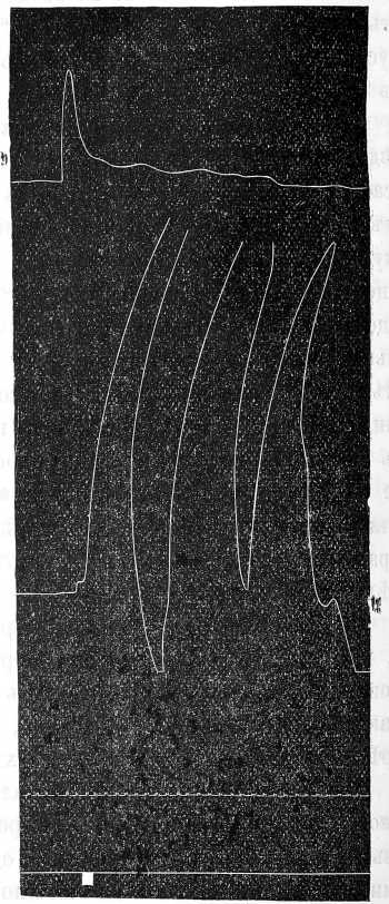 24 Въ опытѣ, изъ котораго заимствованъ рис. 18-й, перо отмѣтчика раздраженія оказалось, по недосмотру, впереди другихъ перьевъ; поэтому отмѣтка раздраженія на этомъ рис. сдвинута вправо.