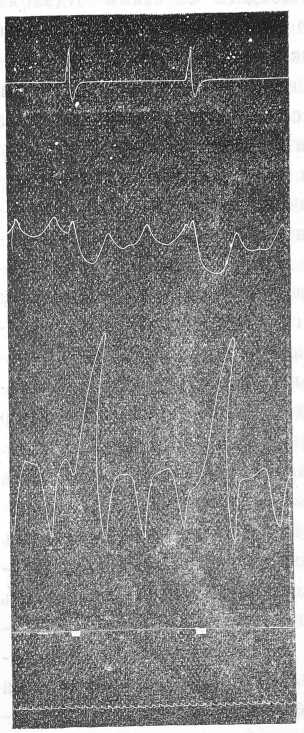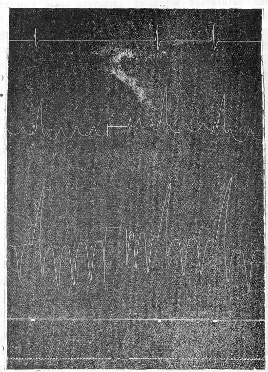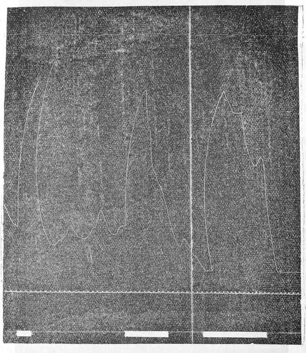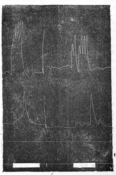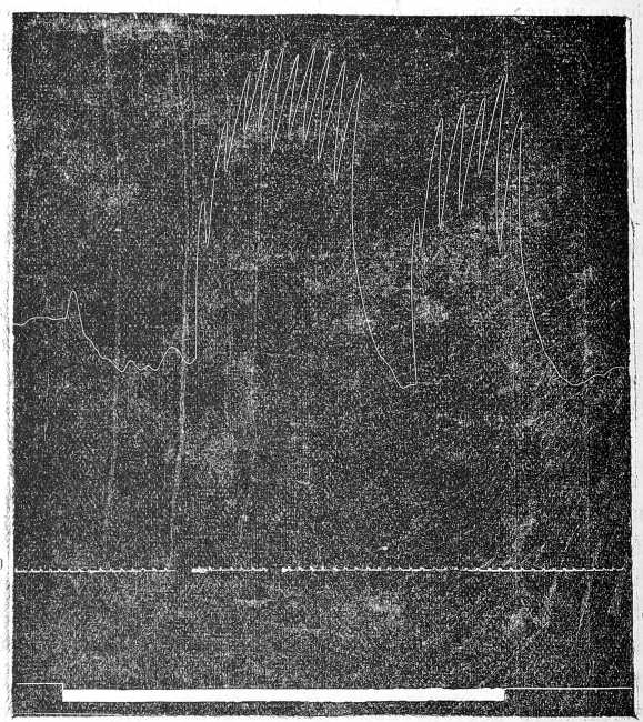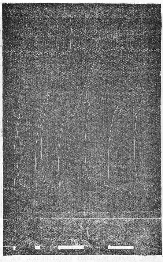 12 Мелкія волны на кривой пищевода (подавленныя сокращенія) выражены на рис. не ясно; это зависитъ, во-первыхъ, отъ недостаточной чувствительности передачи, а, во-вторыхъ, отъ движеній животнаго.