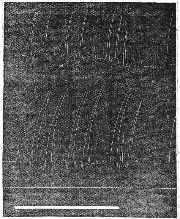 Первую особенность представляютъ изъ себя тѣ случаи 5, въ которыхъ каждое глотаніе сопровождается двумя или нѣсколькими, быстро слѣдующими одно за другимъ сокращеніями пищевода. Насколько можно было судить по наблюденіямъ за шейной частью пищевода, первое сокращеніе есть обыкновенная перистальтическая волна, начинающаяся съ самаго верху пищевода, остальныя же сокращенія—также перистальтическія—начинались съ того мѣста, гдѣ находился кондомъ. Такія добавочныя перистальтическія волны присоединялись также къ сокращеніямъ, вызваннымъ раздраженіями двигательныхъ нервовъ. Добавочныя сокращенія совершенно отсутствовали въ опытахъ съ кураре, а также въ тѣхъ опытахъ, гдѣ препаровка продолжалась очень долго и требовала болѣе глубокаго наркоза. Количество сокращеній и время, въ теченіе котораго они наблюдались, неодинаково въ разныхъ отдѣлахъ пищевода. Въ шейномъ отдѣлѣ большею частью было по одному добавочному сокращенію, и только въ одномъ опытѣ (13-мъ) наблюдалось отъ 2-хъ до 5 сокращеній (рис. 2); кромѣ того, сокращенія появлялись только въ началѣ опыта и продолжались нѣсколько минутъ (не больше 10—15), а затѣмъ безслѣдно исчезали.
