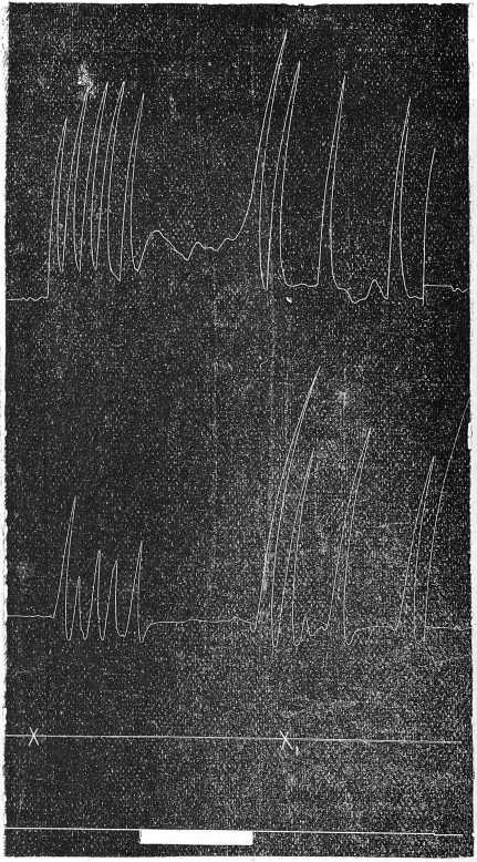 Комбинированное раздраженіе n. laryngei sup. sin. (р. с. 375, X- начало, X1 — конецъ раздраженія) и n. glossopharyngei sin. (два раздраженія при р. с. 350).