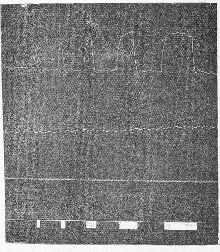 Слѣдующая особенность, до сихъ поръ никѣмъ еще не описанная при одиночныхъ глотаніяхъ, заключается въ болѣе или менѣе сильномъ ослабленіи сокращеній пищевода. На рис. 3-мъ можно видѣть, что первое раздраженіе вызвало одиночное глотаніе, отмѣченное верхней (глоточной) кривой; на кривой пищевода за ясно выраженной "глотательной" отмѣткой слѣдуетъ сравнительно очень слабая волна сокращенія пищевода. Что здѣсь дѣло идетъ не объ утомленіи нервно- мышечнаго аппарата, доказываютъ нѣсколько слѣдующихъ сдѣланныхъ быстро одно за другимъ раздраженій, которыя дали глотанія съ рѣзкими сокращеніями пищевода; одно изъ такихъ раздраженій приводится на томъ же рисункѣ.