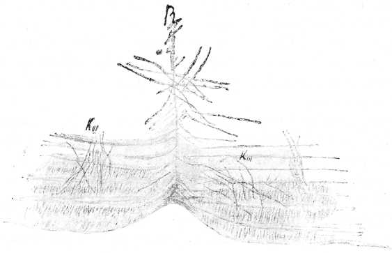 Поперечный разрѣзъ мозга сейчасъ же ниже Вароліева моста у молодой крысы. Ру — Пирамидные пути, отъ нихъ отходятъ. KIII — коллатерали, нѣкоторые изъ нихъ перекрещиваются. Окраска по Golgi. Увелич. 70х.