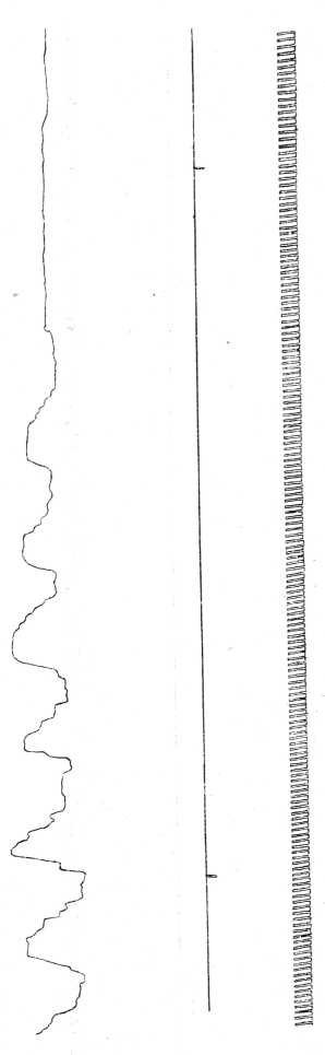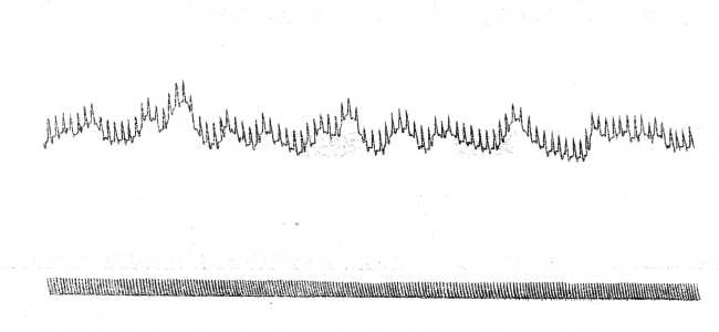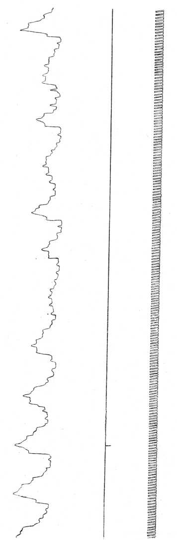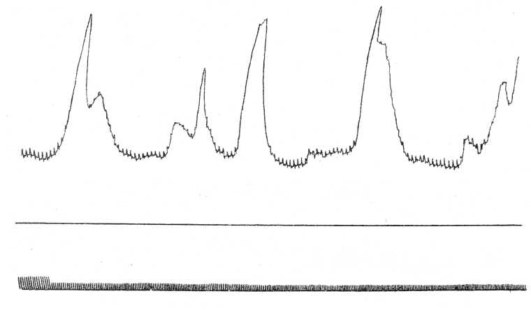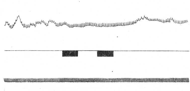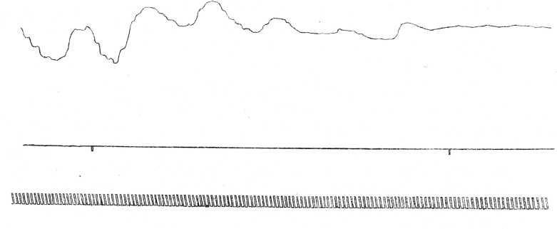 Слабо выраженныя движенія пилорической части желудка; мелкія волны представляютъ собою отраженіе дыхательныхъ движеній; снизу отмѣчены секундные промежутки времени.