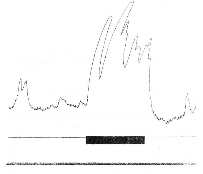 Введеніе кислоты вызвало типичный двигательный рефлексъ, не осложненный одновременнымъ развитіемъ задержки: мы видимъ повышенія тонуса и усиленіе ритмическихъ движеніщ послѣ промывки кишечника Локковскимъ растворомъ возстановились прежняго тина движенія, выраженныя вообще въ теченіе всего опыта очень слабо.