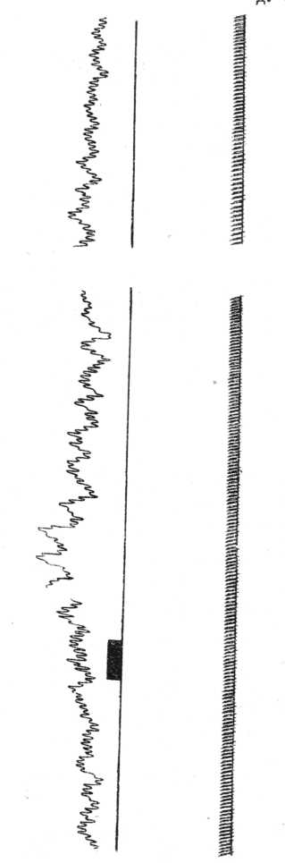 Такъ, въ одномъ изъ опытовъ движенія пилорической части были выражены крайне слабо; (крив. 1) раздраженіе периферическихъ концовъ блуждающихъ нервовъ не только не вызывало обычной картины сокращенія, но сопровождалось яснымъ задерживающимъ дѣйствіемъ (крив. 2).