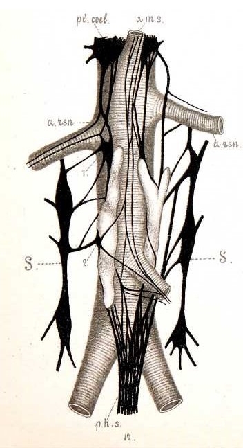 Часть тонкихъ вѣтвей, пересѣкающихъ переднюю поверхность органа, переходитъ, направляясь по этой поверхности внизъ и медіально, въ pl. mesent. inf., часть же можетъ (это бываетъ довольно рѣдко) въ области нижняго отдѣла органа снова соединиться съ тѣми стволами, которые идутъ позади него. Главная масса вѣтвей, проходящихъ позади органа, внизъ продолжается въ pl. hypogastr. superior. Иногда тѣ вѣтви, которыя проходятъ между органомъ и аортой, бываютъ соединены между собой въ очень тѣсное сплетеніе, такъ что получается какъ бы подошва, къ которой органъ прилегаетъ спереди. Органы, очень вытянутые въ длину, изрѣдка имѣли позади себя только одинъ нервный стволикъ, который могъ содержать по своему ходу 1—2 узелка, расположенныхъ позади тѣльца,—на мѣстахъ соединенія стволика съ анастомотическими нитями къ другой сторонѣ pl. aort. abd. или же на мѣстахъ отхожденія отъ стволика нервныхъ нитей, перекрещивающихъ органъ спереди. Чаще всего близь верхняго конца тѣльца имѣлся узелъ, обыкновенно на томъ мѣстѣ, гдѣ со стволикомъ или пучкомъ нервныхъ нитей, проходящихъ позади органа, сливалась одна изъ анастомотическихъ вѣтвей отъ пограничнаго ствола этой области (см. рис. 19-й, узелъ 1). Если существовалъ еще второй узелокъ, прилегающій къ органу, то онъ также обыкновенно располагался на мѣстѣ сліянія анастомозовъ отъ truncus n-vi symp. съ pl. aort abd. (см. тотъ же рис., 2). Довольно часто переднюю поверхность органа перекрещивали, анастомозируя съ латеральными отдѣлами сплетенія аорты, очень тонкія нервныя нити, которыя спускались изъ области корня art. mesent. sup. и занимали средину передней поверхности аорты, а внизъ переходили въ pl. hypog. super. и рl. mesenter. inf. На рис. 19-мъ видно, какъ одна такая нить перекрещиваетъ средину праваго тѣльца, чтобы соединиться съ узелкомъ 2. Другая тонкая вѣточка, отходящая отъ этого узелка, направляется здѣсь, пересѣкая переднюю поверхность тѣльца, къ корню нижней брыжжеечной артеріи, гдѣ она участвуетъ въ образованіи pl. mesent. inf. На 19-мъ же рисункѣ представлена тоненькая вѣточка, опоясывающая лѣвый органъ. Она вверху и внизу соединяется съ лѣвымъ пучкомъ аортальнаго сплетенія, который располагается позади лѣваго тѣльца. Прослѣдить переходъ латеральныхъ пучковъ аортальнаго сплетенія у нижнихъ концовъ добавочныхъ органовъ въ plexus nypogastr. superior и на art. mesent. inf. точно также можно на этомъ рисункѣ.