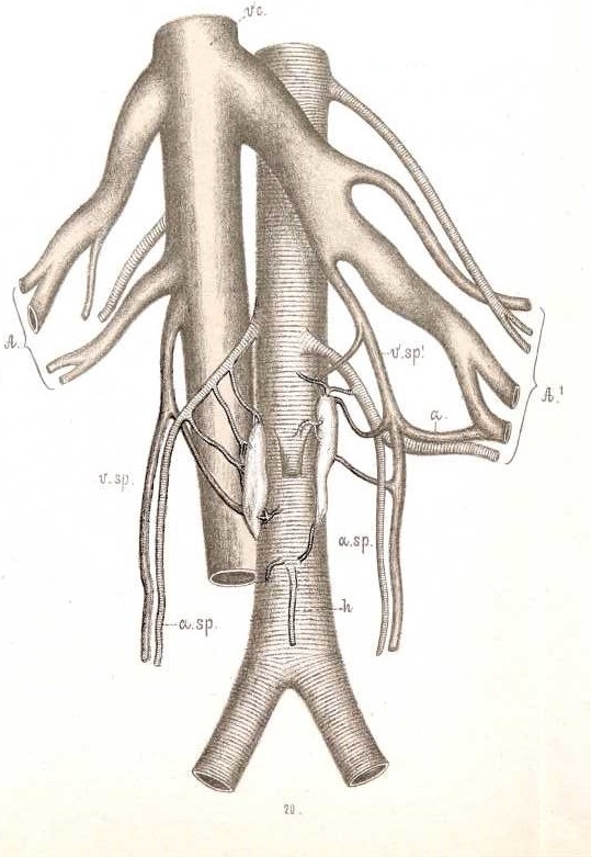 № 20. (Муж., 3-хъ нед.). | Переш. нѣтъ; лѣвый органъ раздвоенъ вверху. П. 20,0-2,0 Л. 17,0-2,0 | 10 арт.: 1-я отъ а. mes. inf.; 2-я отъ правой art. sperm. int.; 3-я и 4-я отъ лѣвой art. sperm, int.; 5-я, 6-я и 7-я отъ аорты (отх. выше, чѣмъ аа. sperm, int.); 8-я, 9-я и 10-я отходятъ отъ аорты ниже art. mesent. inf. | 6 венъ: 1-я, 2-я, 3-я (изъ праваго органа)—впад. въ ѵ. cav. inf., 4-я— въ ѵ. ren. sin., 5-я, 6-я—въ ѵ. sperm, int. sin. | |