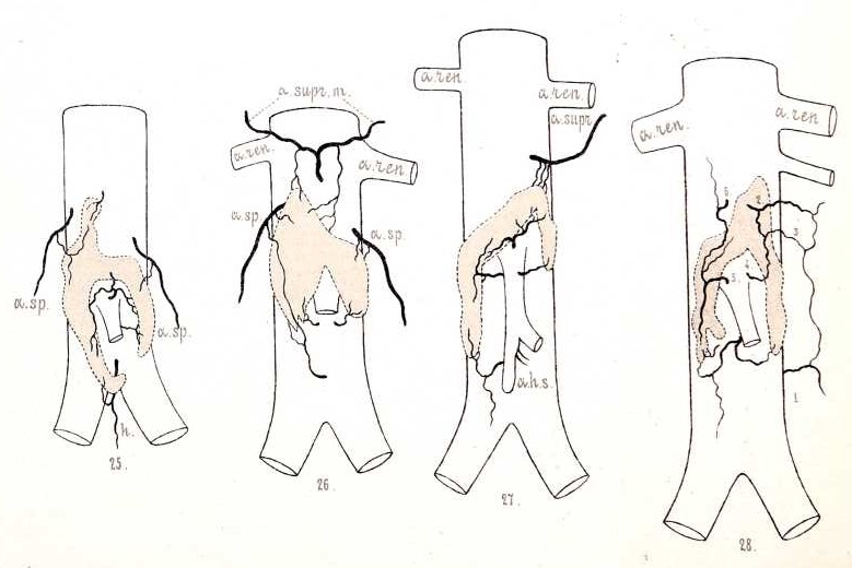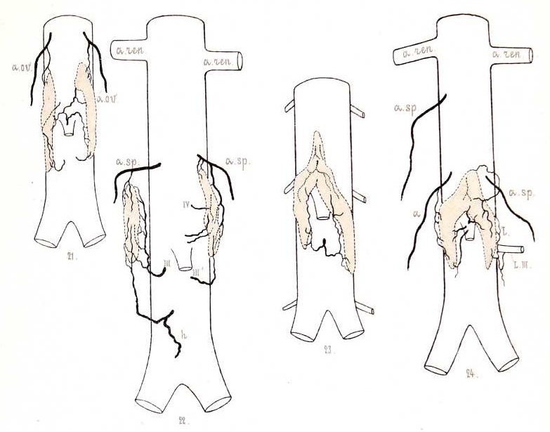 Изъ деталей я укажу на то, что-очень часто одна или 2 изъ артерій, подходящихъ къ тѣльцу, были развиты значительно больше остальныхъ и тянулись параллельно краю органа, отдавая мелкія вѣточки въ его толщу. У органа, изображеннаго на рис. 22-мъ, это имѣется съ обѣихъ сторонъ; справа достигаетъ значительной величины вѣтвь аорты, слѣва— вѣтвь сѣменной артеріи. У подковообразныхъ тѣлецъ чаще всего сильно развита была артерія, отходящая отъ корня нижней брыжжеечной; она дѣлилась обыкновенно при этомъ на правую и лѣвую вѣтвь, которыя окаймляли перешеекъ снизу, продолжаясь часто на колѣна органа, и въ свою очередь давали короткія вѣточки, непосредственно проникавшія въ тѣльце; рисунки 25-й и 27-й иллюстрируютъ эти отношенія. Объ участіи вѣтвей нижней брыжжеечной артеріи въ питаніи перешейка говоритъ уже Zuckerkandl (1), а позднѣе также Sperino е Balli (12).