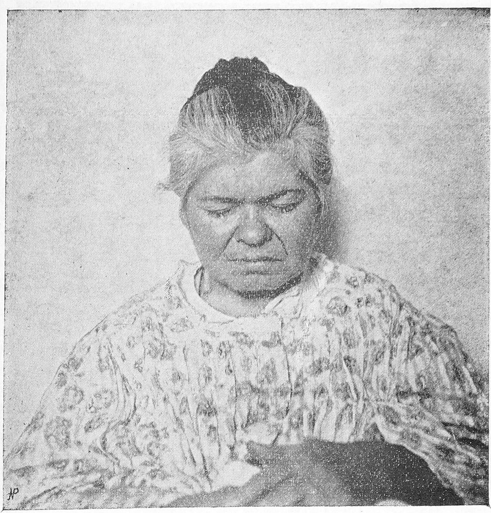 Дрожание в слабой степени имеется и в мышцах нижних конечностей и головы. Дрожание всюду синхронично с дрожанием пальцев. Голова слегка наклонена кпереди. Глаза плотно закрыты (см. фиг. 3). В веках того и другого глаза замечается мелкое дрожание. Подобное же дрожание наблюдается и в языке. Лицо совершенно безжизненно, маскообразно, без какого бы то ни было определеннаго выражения душевнаго состояния. Мышцы лба в состоянии значительнаго напряжения. Брови на одном уровне.