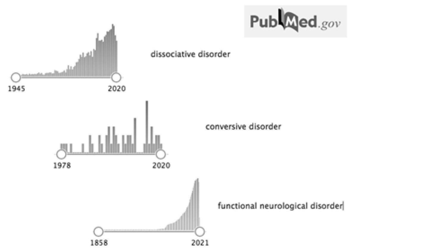 A new insight into the etiopathogenesis of hysteria, which was first transformed into the so-called dissociative (conversion) disorder, and now appears as a functional neurological disorder, is of particular interest. On this occasion, it was stated that “a disorder of the mind and brain, which is a mysterious condition, once known as hysteria, challenges the separation of psychiatry and neurology” [16]. The dynamics of scientific ideas about hysteria and dissociative (conversion) disorders are reflected in the number of works focused on functional neurological disorders is growing dramatically and decreasing about hysteria and dissociative (conversion) disorders (Fig. 1).
