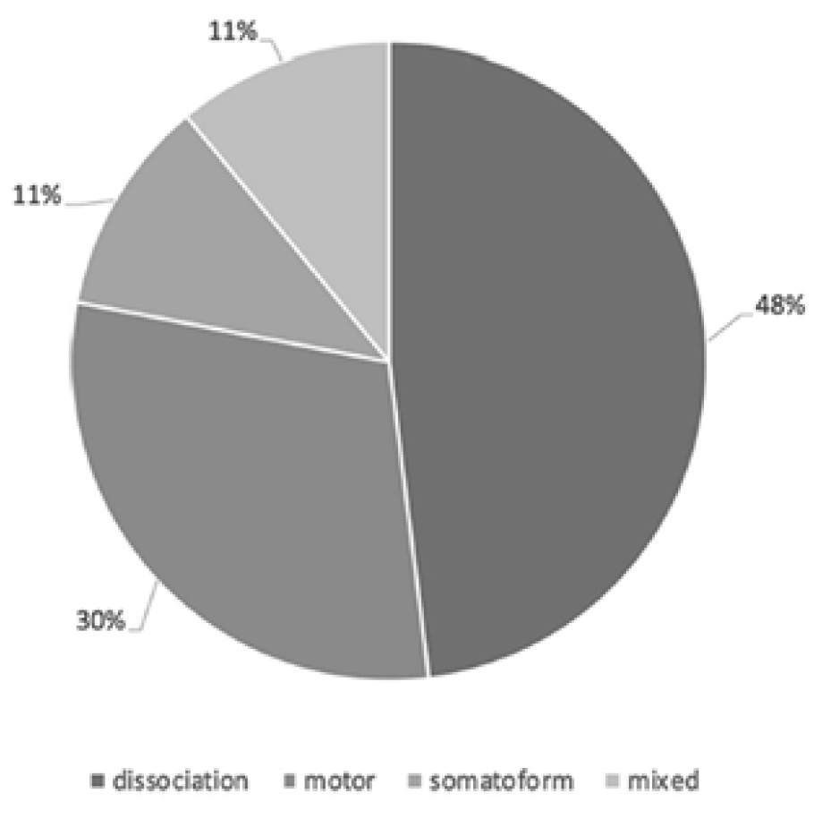 A functional neurological disorder is heterogeneous. Traditionally, it includes movement disorders, such as dystonia, paralysis, tremor, and balance disorders. However, a functional neurological disorder is often manifested by various somatic symptoms, such as dizziness, headaches, and non-epileptic seizures [18]. According to P. Pun et al. [19], the symptom distribution of functional neurological disorder is as follows (Fig. 3):